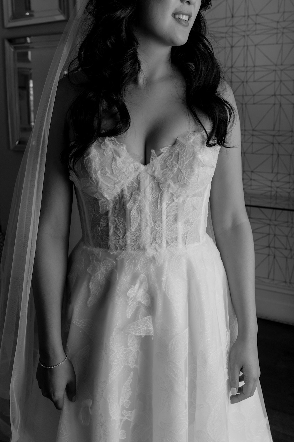 “After visiting and trying on numerous dresses, my mum and I unexpectedly stumbled into Raffaele Ciuca. I walked into the Brunswick store and saw this dress on a mannequin which was part of the Jessica Couture/Atelier Wu trunk show collection. It had absolutely everything I was looking for – strapless, a-line, not too puffy, beautiful lace detailing, and 3D flowers/butterflies that were sewn on to give the dress some texture. My wedding was in the garden and this dress fitted me and the venue perfectly.”