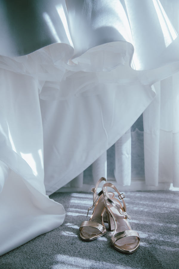 I wasn’t sure what kind of wedding dress I wanted, but I was pretty set on what I didn’t want. The list of things I didn’t want included lace, bling, strapless, pouf… I really liked the flat silk look, and had previously tried on an across-the-shoulder dress at a different bridal shop and liked that it was a bit more modern. When I tried on my dress, I loved the top of it but wasn’t sure about the fullness of the skirt, or the long train. My mum and future sister-in-law convinced me it was “the one” – and they were right!