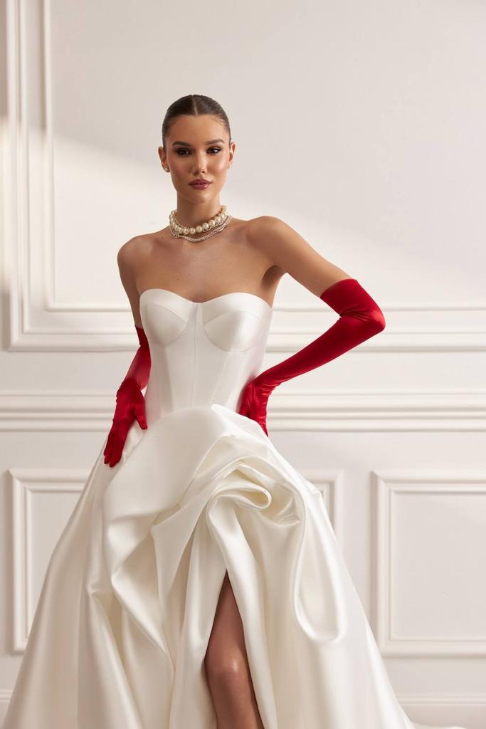 Oksana Mukha is synonymous with refined luxury and intricate craftsmanship, where couture techniques meet ornate detailing and precise fit. With a heritage rooted in European atelier tradition, each gown reflects a deep commitment to artistry and construction.