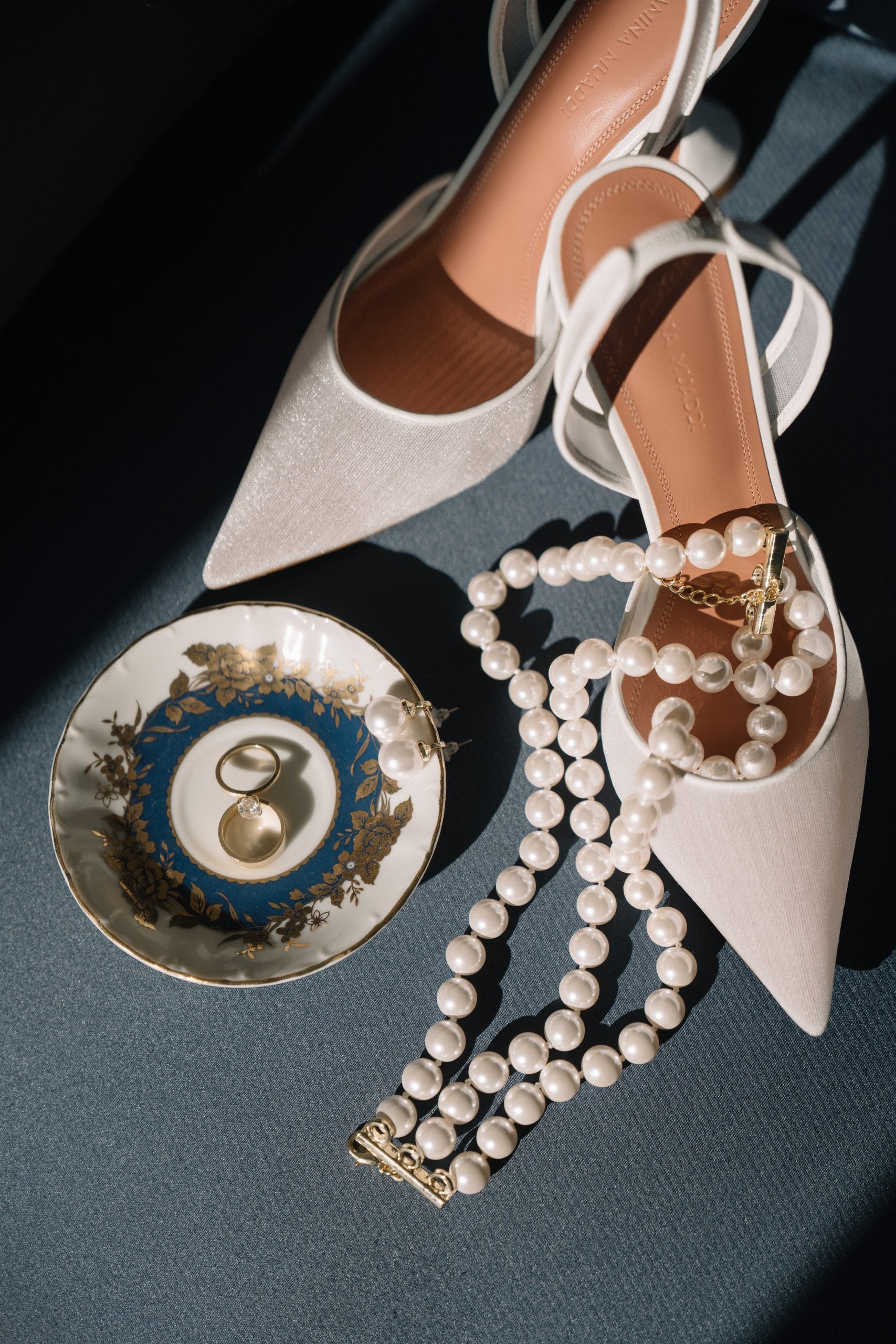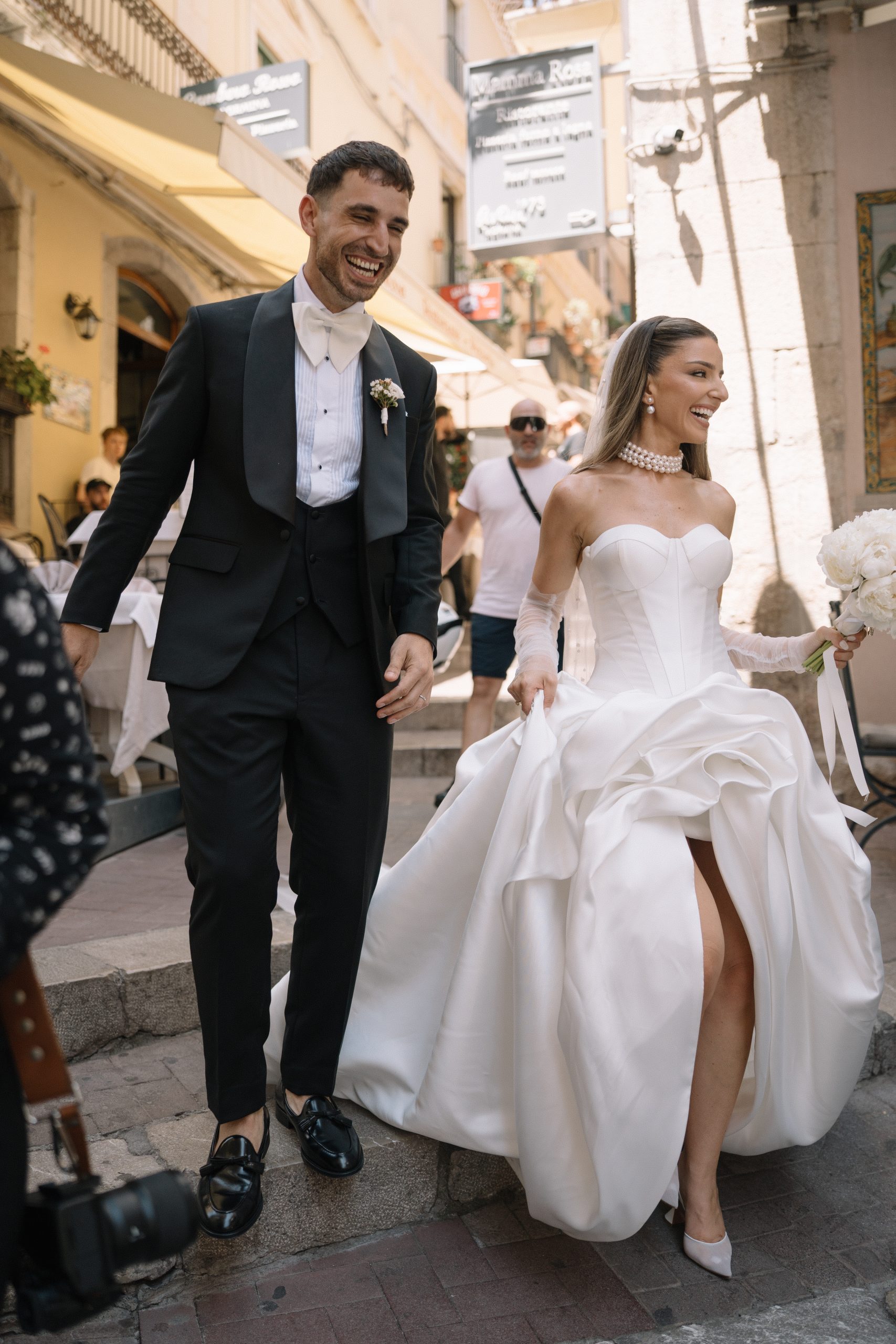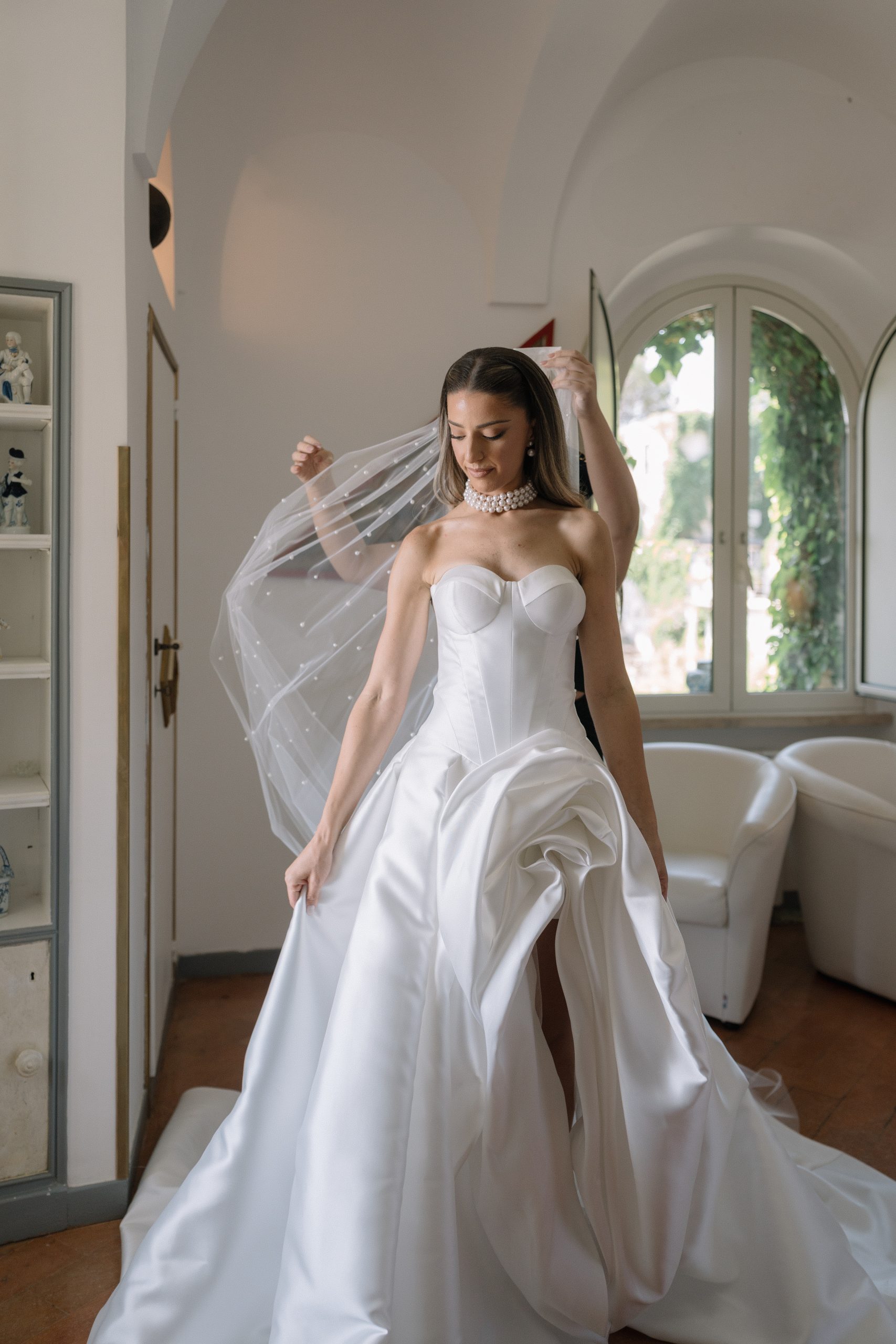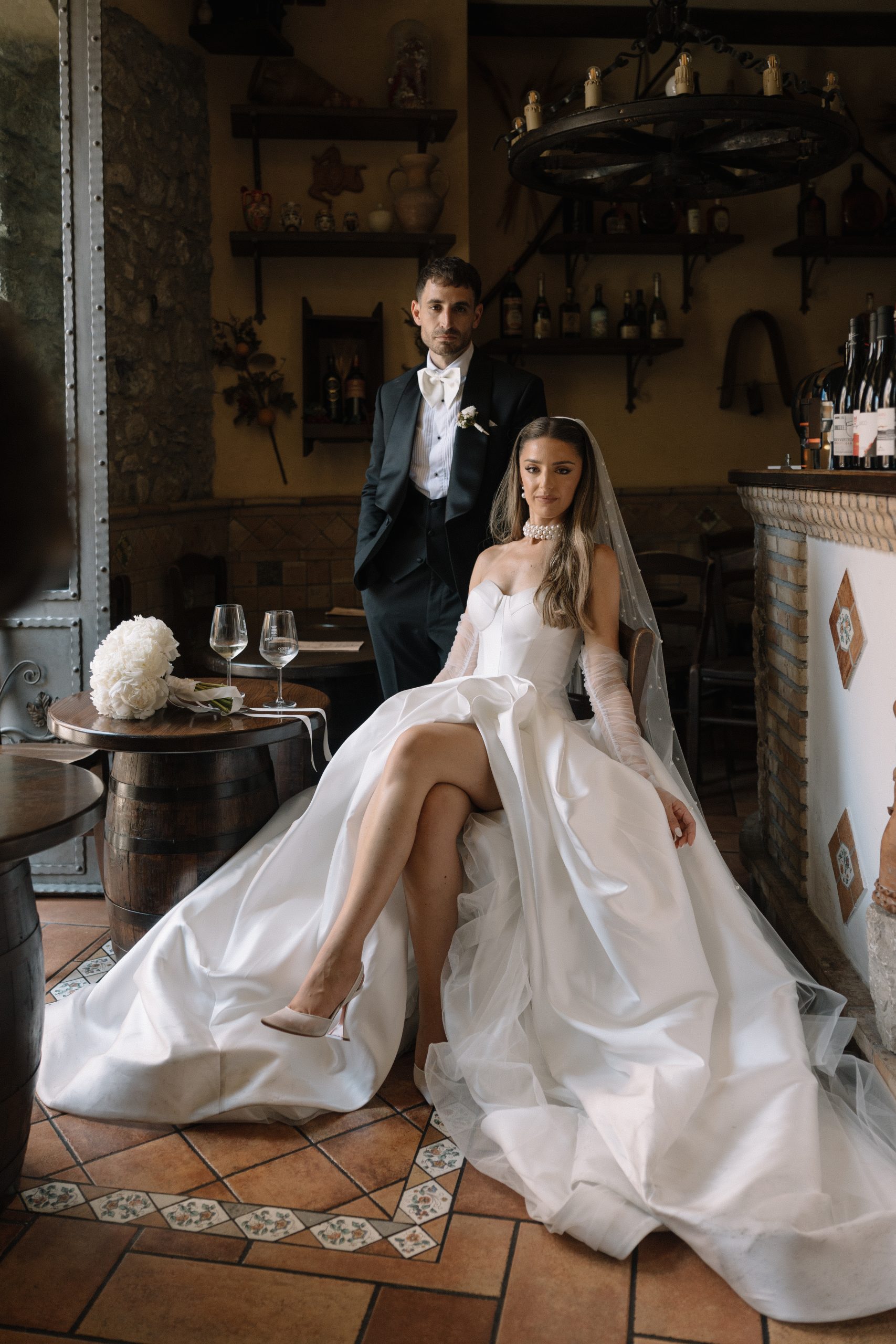 Enza’s bridal look was the perfect balance of vintage elegance and modern sophistication. She wore the Sisley gown by Oksana Mukha, a design celebrated for its refined detailing and timeless silhouette. This gown framed her vision of vintage chic, while her accessories told the rest of the story: strands of grand pearls, a dramatic pearl-scattered veil, and a bouquet of classic white roses. Together, these elements created a look that was both editorial and deeply personal.