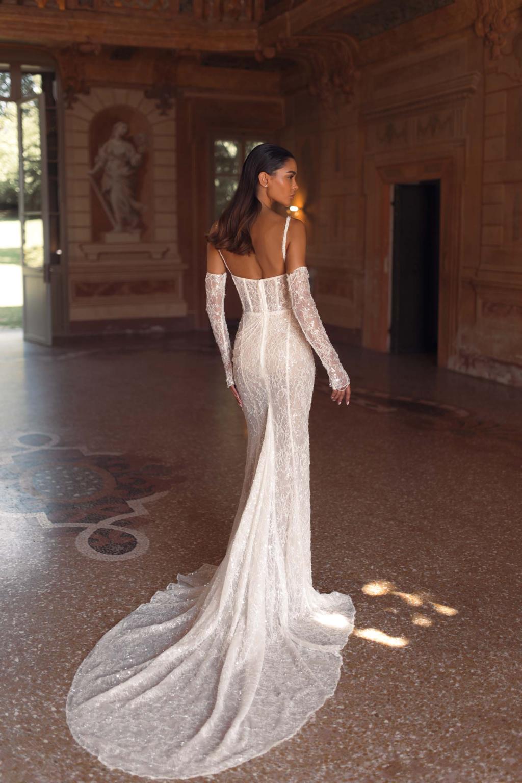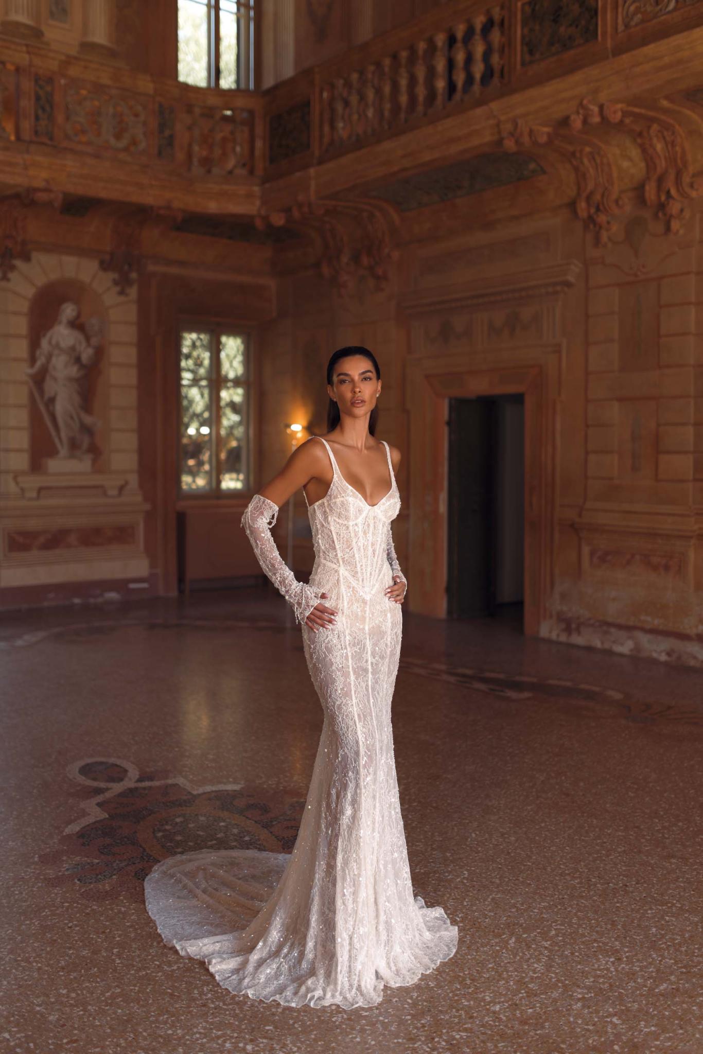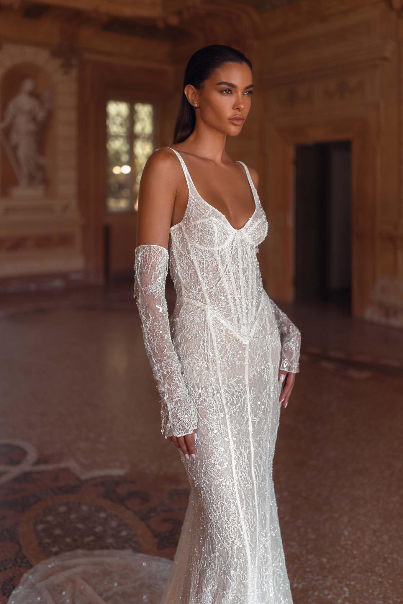 Elevate your bridal look with the ultra-glamorous Berta Privee 24-P107 gown — a striking blend of sensual elegance and couture detail. Crafted with exquisite lace and delicate beadwork, this form-fitting mermaid silhouette features a structured corset bodice with slender straps, enhancing natural curves with sophistication and grace. The gown's sheer panels, intricate embroidery, and matching lace gloves create a bold yet refined aesthetic, perfect for the confident bride who wants to turn heads. With its flawless craftsmanship and dramatic presence, the 24-P107 is an unforgettable choice for modern luxury weddings. Discover the artistry of Berta Privee — shop the exclusive 24-P107 gown now and make your dream day unforgettable.Price Guide: $8,000 - $14,999