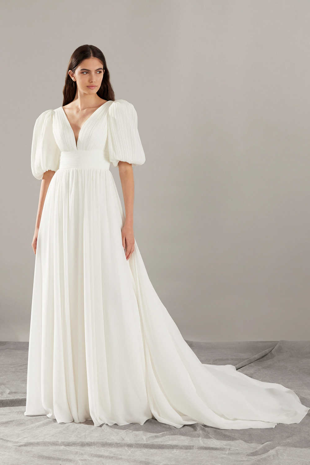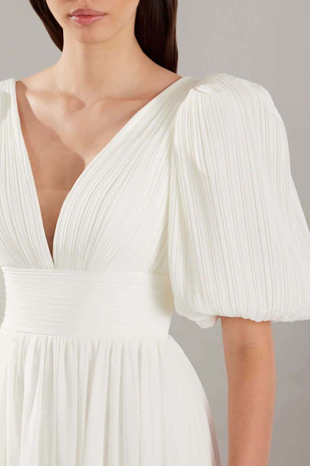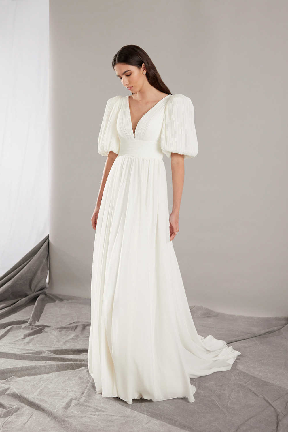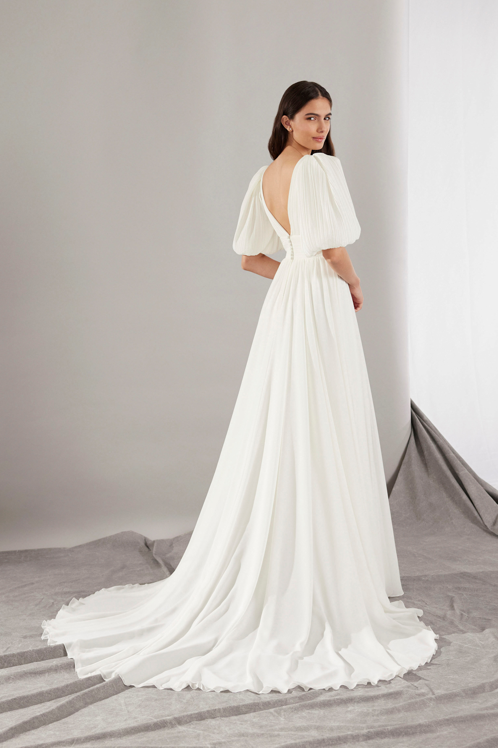 With its pleated chiffon and flowy skirt, this dress promises to provide optimal comfort and elegance on your big day.