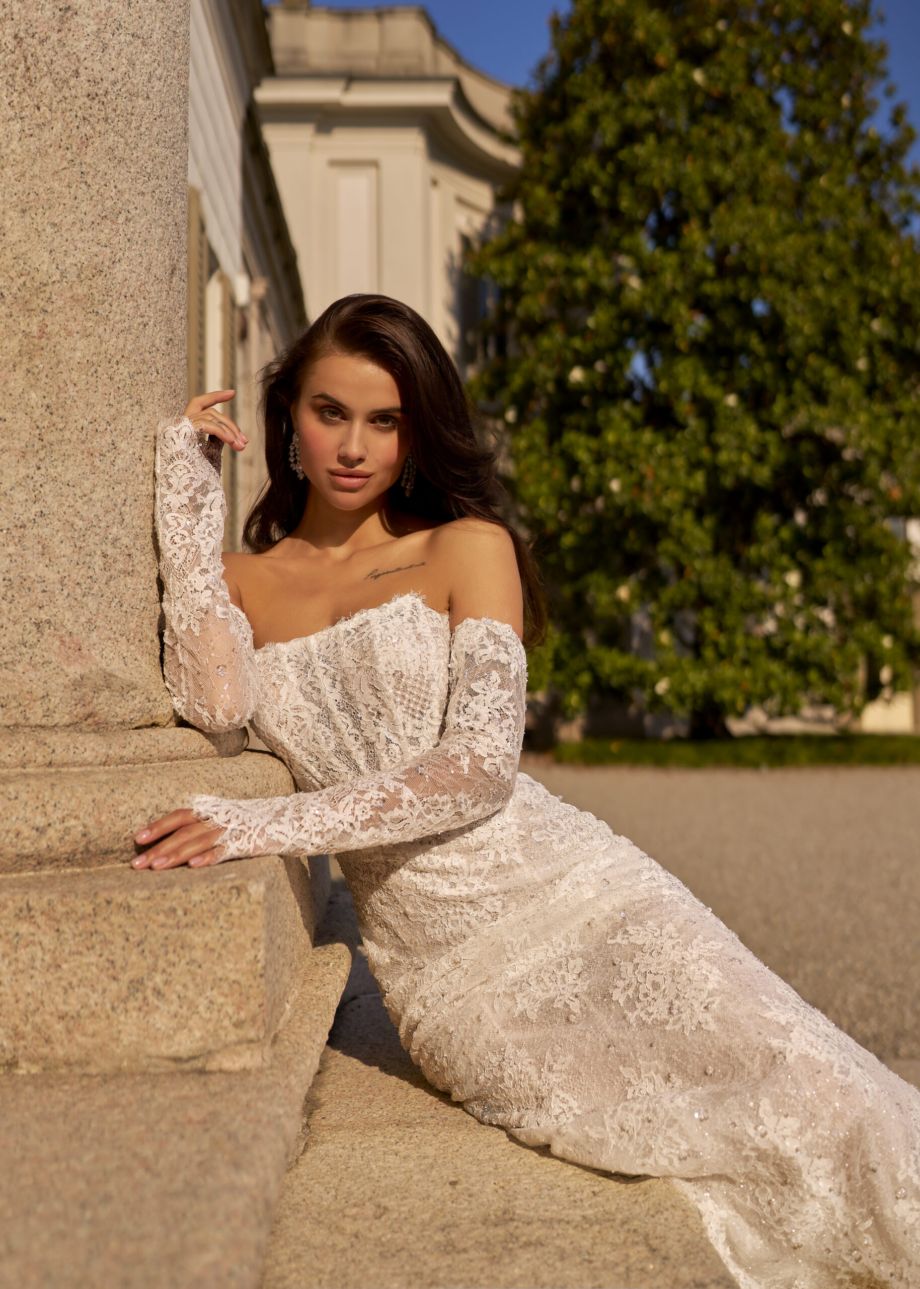 Alaya is an intricate beaded lace wedding dress that embodies sensual sophistication. This stunning piece features exposed boning, a statement, peaked back, and detachable sleeves.