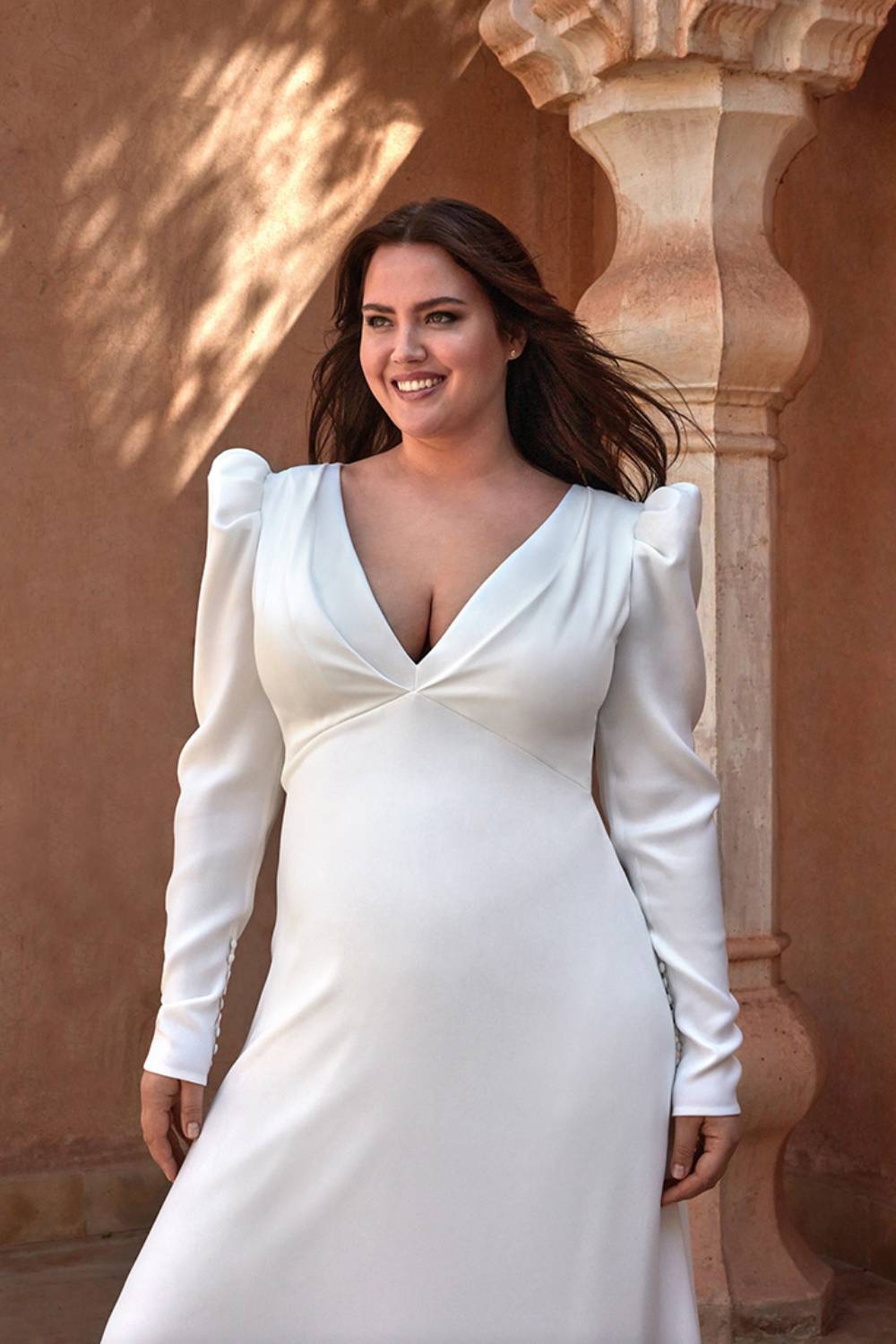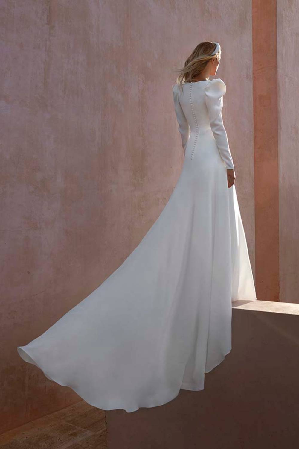 The Amis Wedding Gown is a stunning long sleeve, crepe a-line gown by Pronovias. This minimalistic design relies on creating a stunning shape for its wearer, with it’s leg of mutton sleeve, plunging v-neck and covered buttons that run down the length of the zip. The elegant simplicity of this gown is sure to remain a timeless piece to be looked back at and adored.