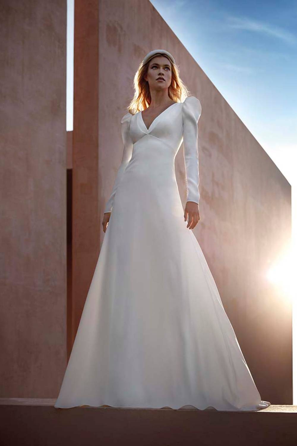 The Amis Wedding Gown is a stunning long sleeve, crepe a-line gown by Pronovias. This minimalistic design relies on creating a stunning shape for its wearer