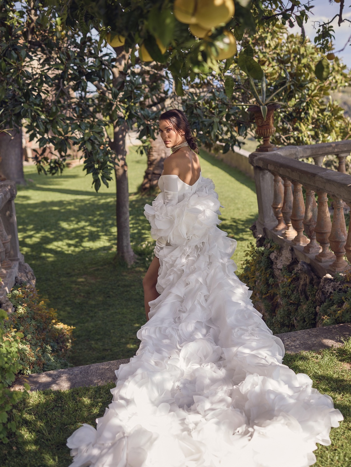 This statement bridal cape is crafted to evoke romance and couture drama. Designed with voluminous, hand-layered organza ruffles, it cascades from the shoulders into a sweeping train that moves beautifully with every step. The sculptural texture creates depth and softness, transforming any gown into an unforgettable bridal look.