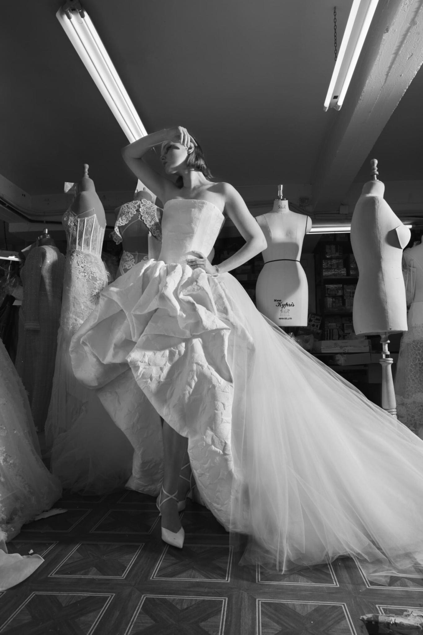 Dramatic couture gown with a straight bustier and puffed balloon skirt crafted in quilted jacquard. Sculpted in a natural white tone.