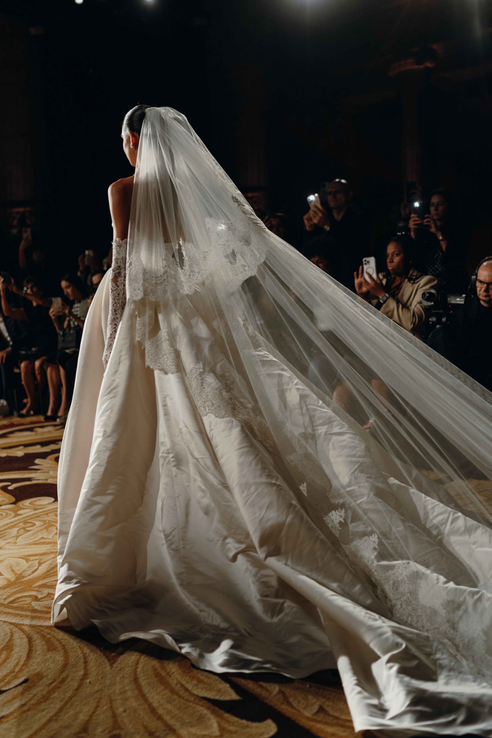 Regal Berta Bridal Wedding Dress. The 25-114 is the perfect blend of timeless sophistication and couture drama. This flawless gown is crafted from rich, luminous satin and features a structured bodice with a delicate lace trim and basque waist. Perfect for grand, opulent weddings.