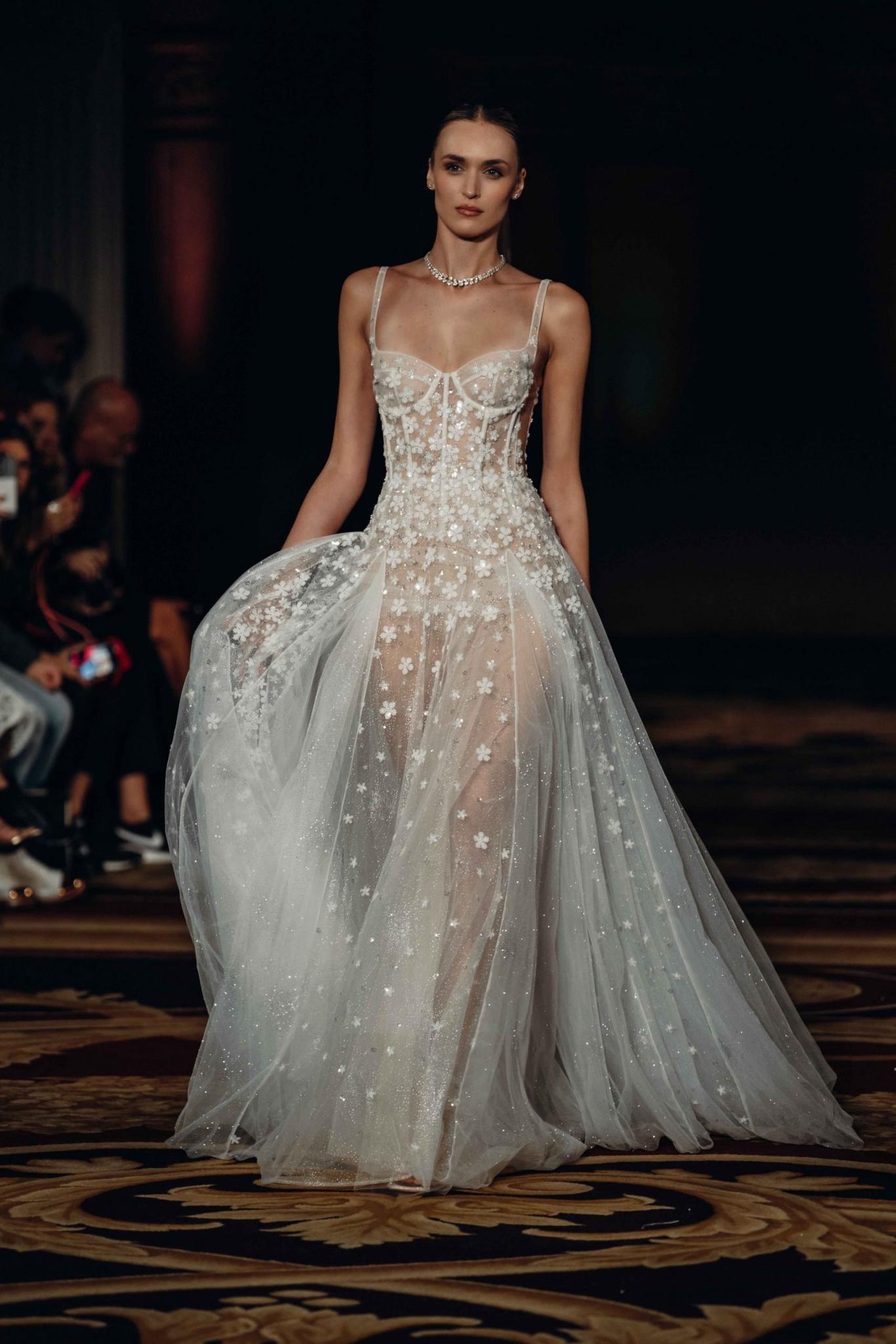 The Berta Palmer 25-134 is a luxurious, showstopping wedding dress featuring an architectural exposed bodice and delicate floral detail.