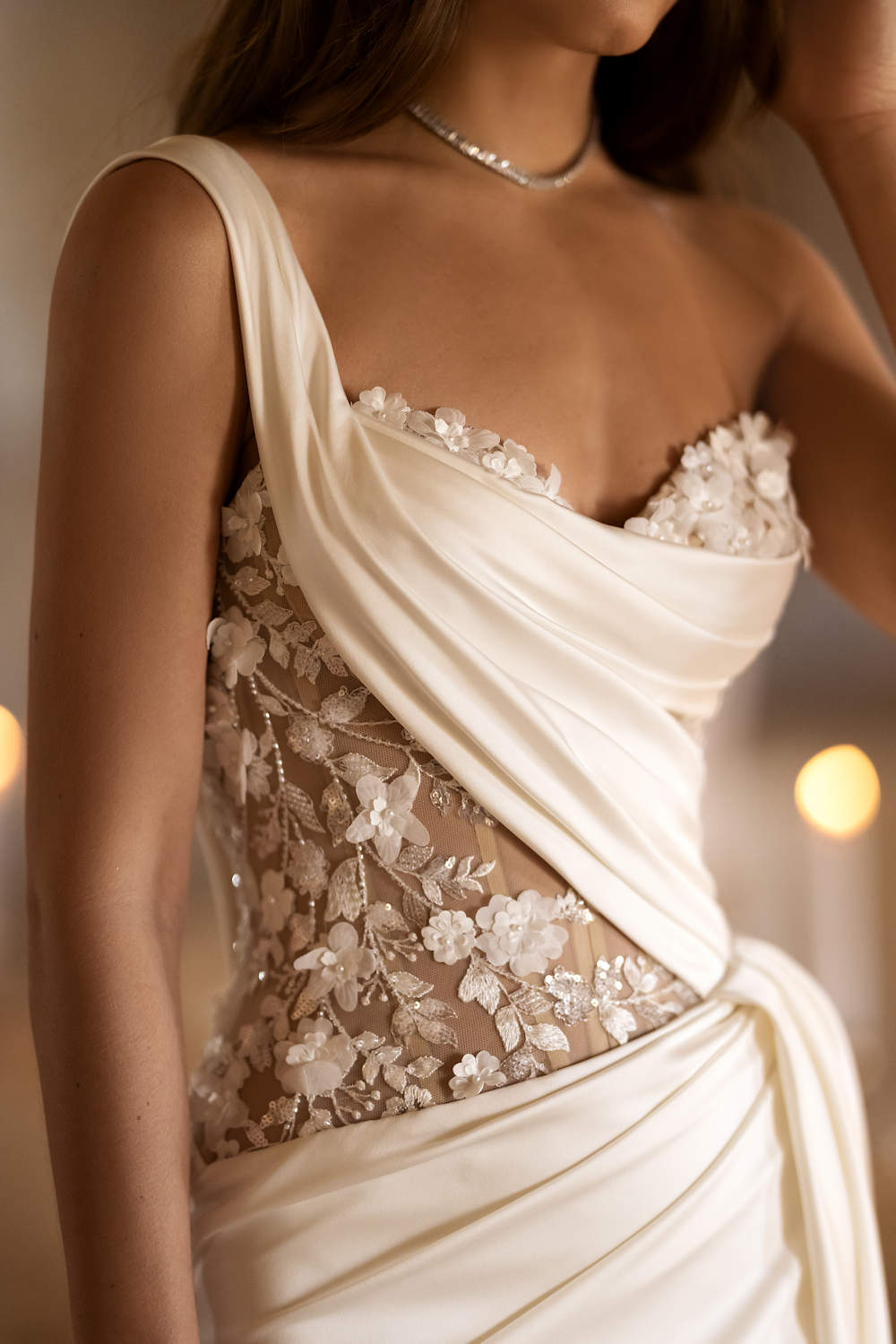 Carven Wedding Gown – Experience the epitome of elegance with this alluring sheath wedding dress. The transparent corset, adorned with exquisite floral appliques, creates a captivating and romantic effect. With its one asymmetrical strap and decorative elements crafted from glossy fabric, this dress exudes sophistication and charm. The wrap skirt gracefully cascades, adding a touch of whimsy and movement to your every step. To showcase your confidence and style, a high slit on the leg adds a hint of allure. Be prepared to make a statement and leave a lasting impression as you walk down the aisle in this captivating wedding gown.