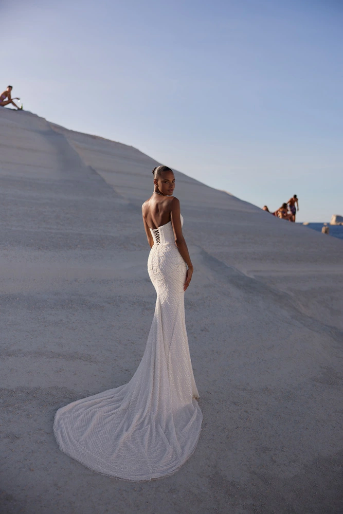 Classy, art-deco-inspired wedding dress with all-over, sparkling embroidery. A scoop, cat-eye neckline and flowing train add to the gown's glamour. Add the optional overskirt for a versatile look.