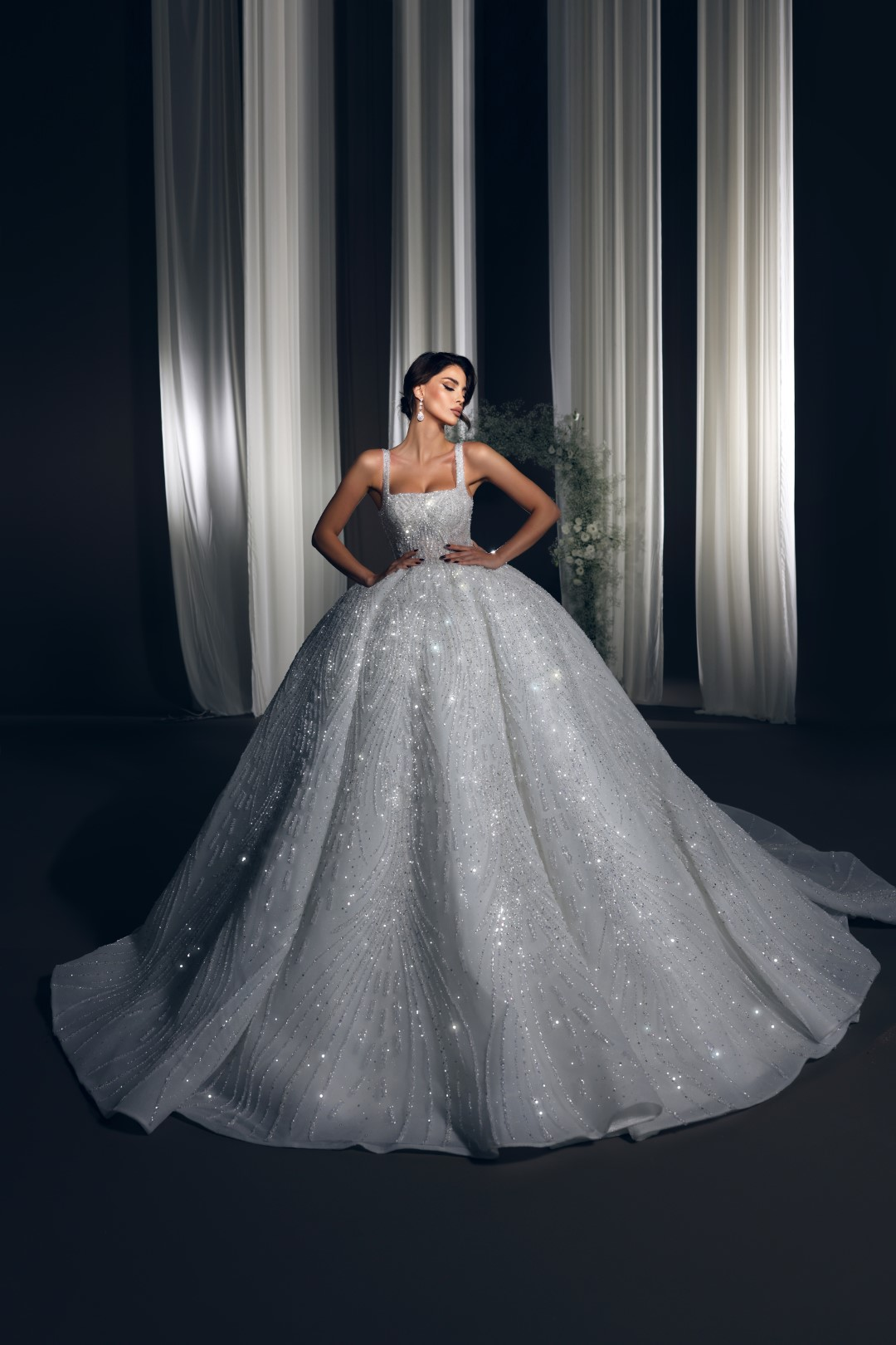 Glittering bold ballgown with sparkling fitting straps, a figure-fitting silhouette, and dramatic full skirt.