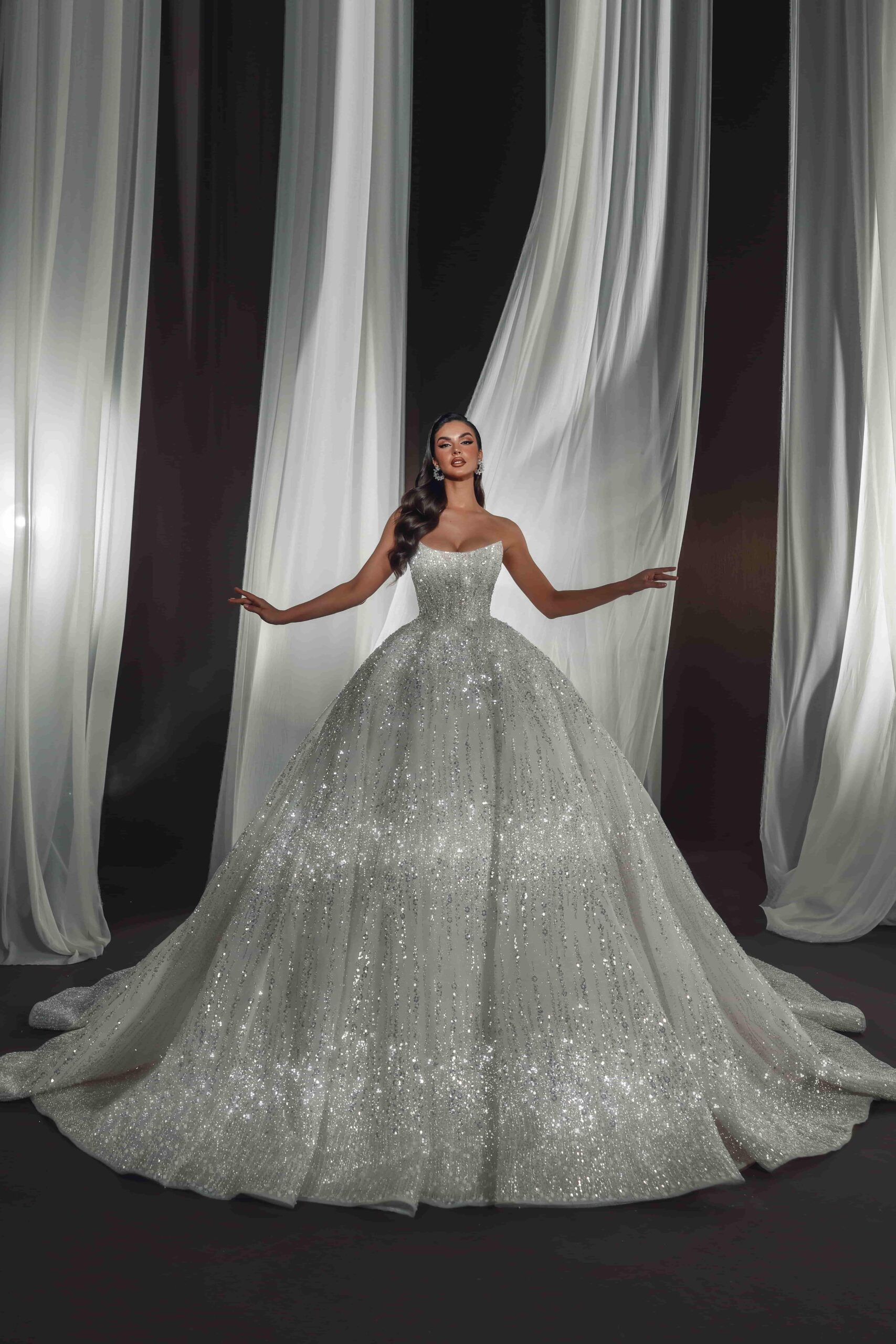 Glittering ballgown with a tied back, figure-fitting silhouette, and dramatic puffy skirt.