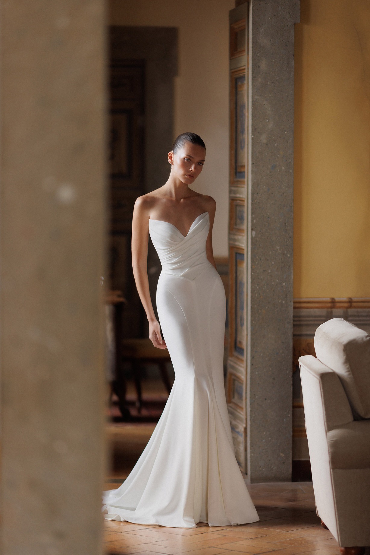 Heart-shaped neckline wrapped corset with a skirt consisting of smooth sleek crepe fabric.