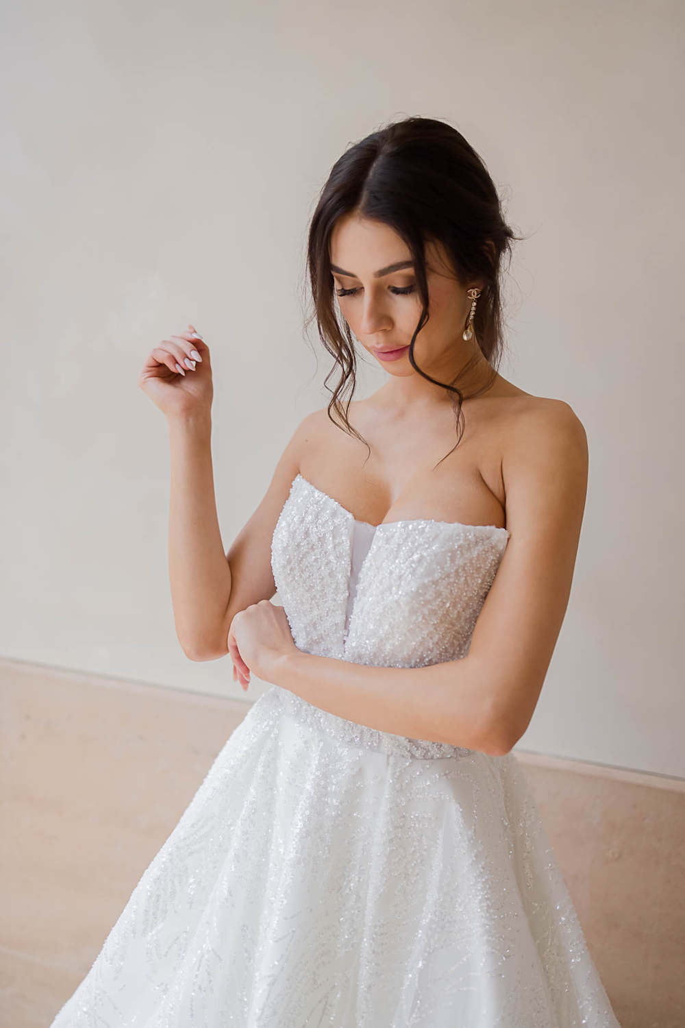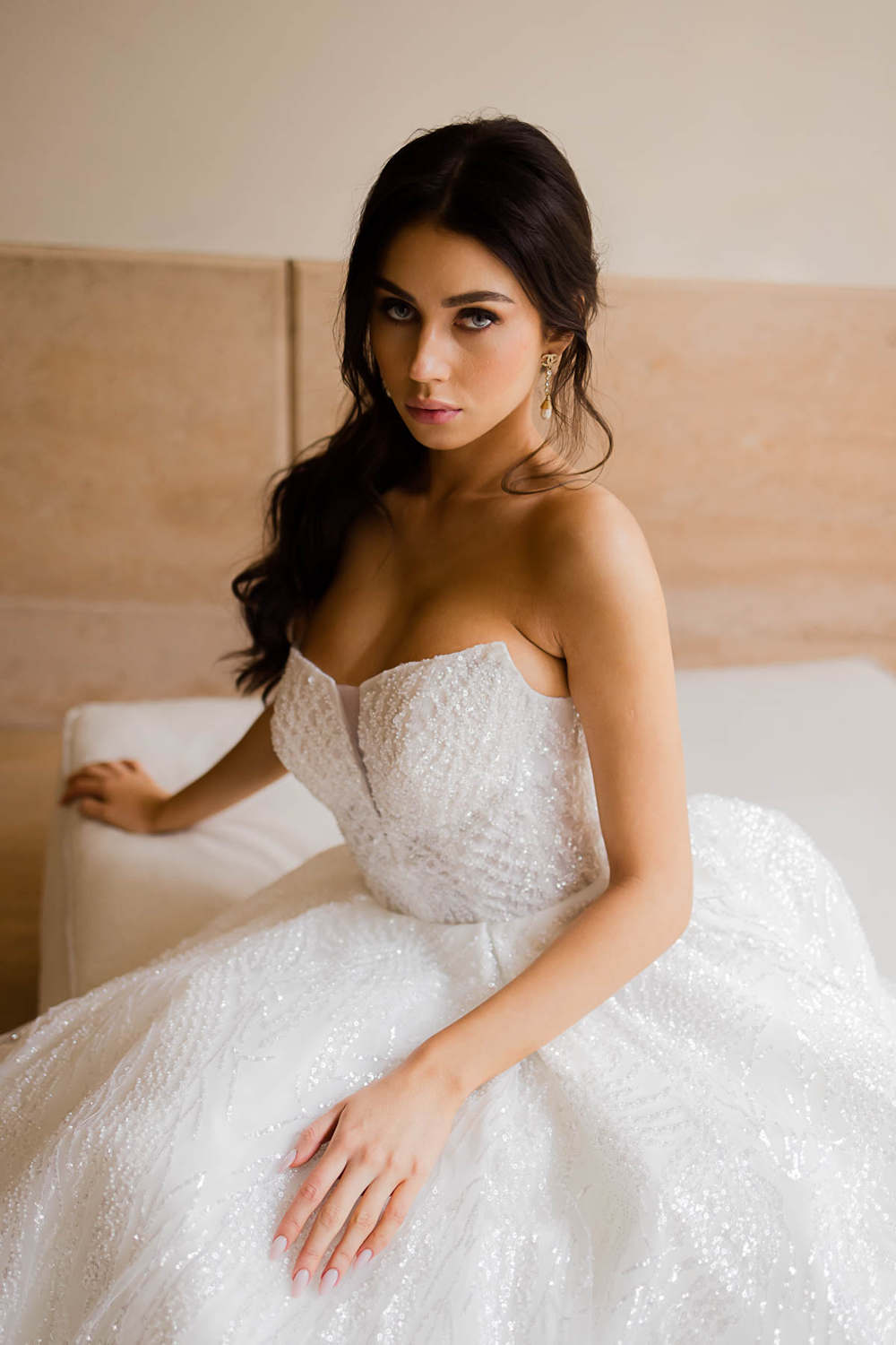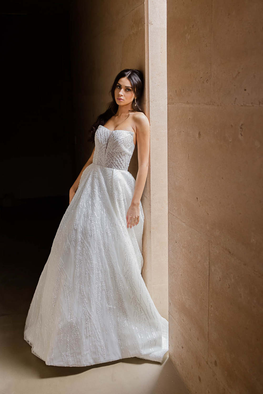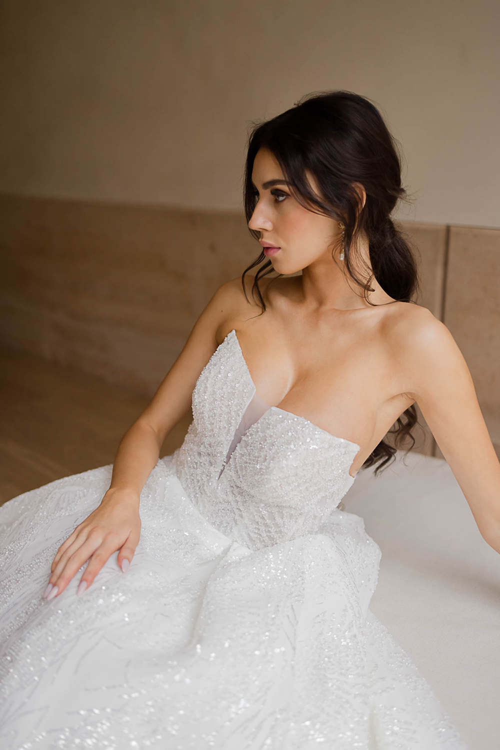 Adorned in glitter beaded lace featuring a dreamy long train.
