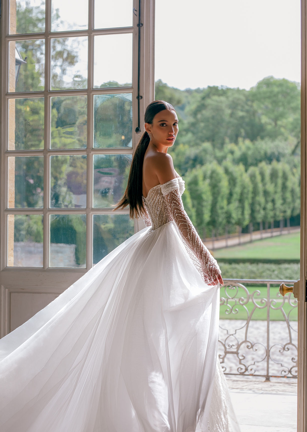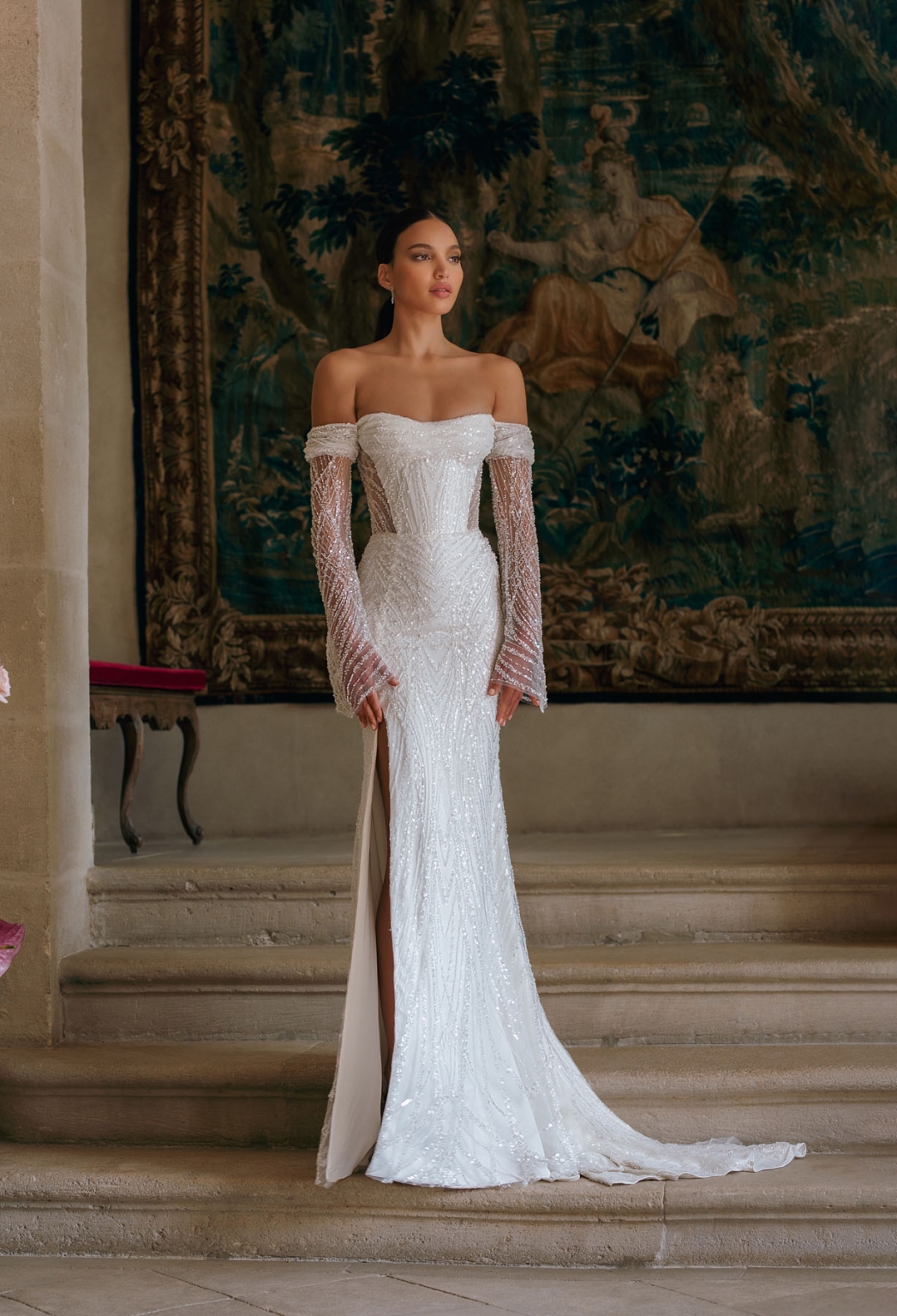 Effie Wedding Gown: Effie is a luxurious fitted mermaid gown made of exclusive beaded lace. The off-shoulder neckline bares the collarbones adding seductiveness, the corset is decorated with sheer nude side pannels and long translucent lace sleeves look extravagant. The sheath skirt is embellished with thigh high slit and a tulle overskirt is fastened on the waistlinPrice Guide: $3,000 - $4,999