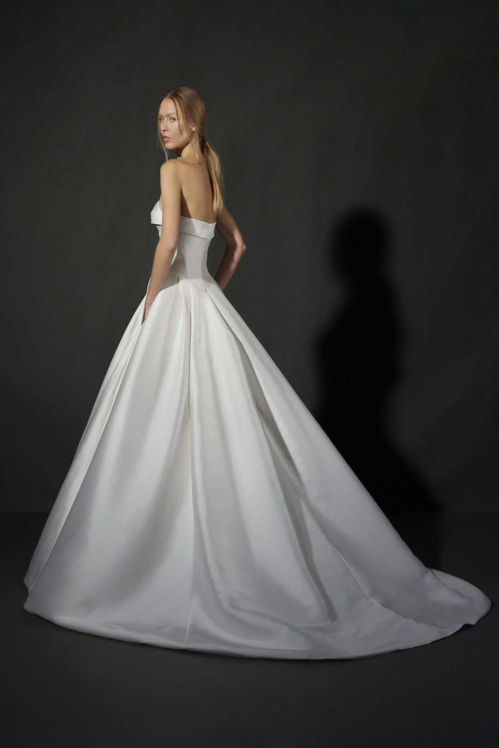 Choose this princess-cut model with a sleeveless bodice and a heart-shaped neckline, featuring a small opening in the center. The skirt includes pockets that add movement. Add a touch of sophistication with a large floral neckline adornment (not included in the price).Price Guide: $5,000 - $7,999
