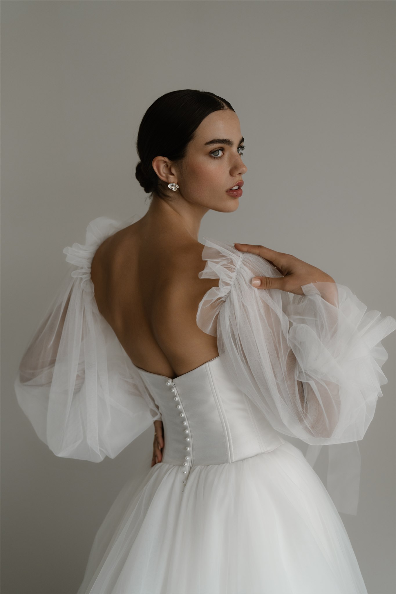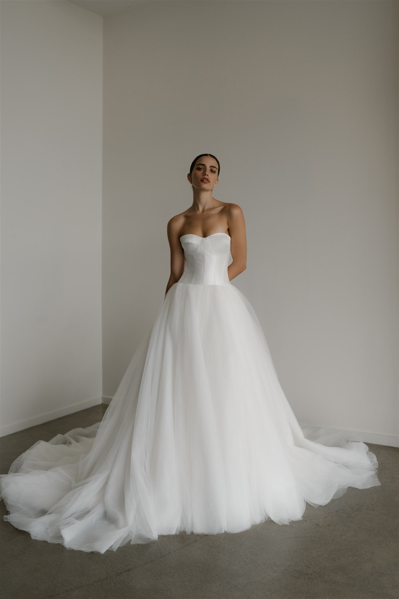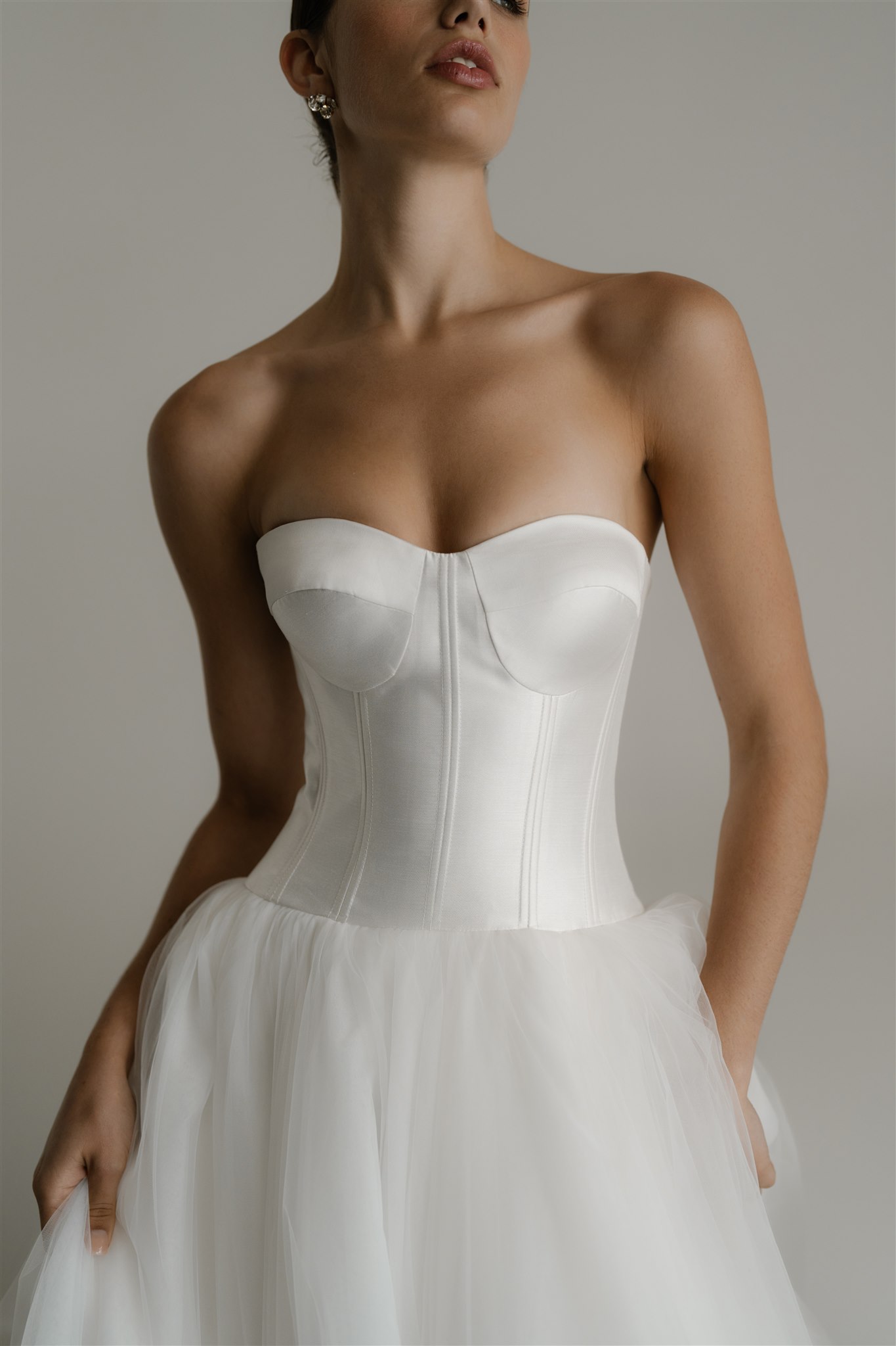 Designed with an exposed bustier, Florence’s Silk Drill Satin corset contours to a bride’s body perfectly. The bodice is slightly longer than the natural waistline to accentuate and enhance a woman’s hourglass silhouette and is finished at the back with pearl buttons. The multilayered, laser-cut, tulle skirt is romantic and fun and is the ideal combination of modern bride and fairytale wedding.