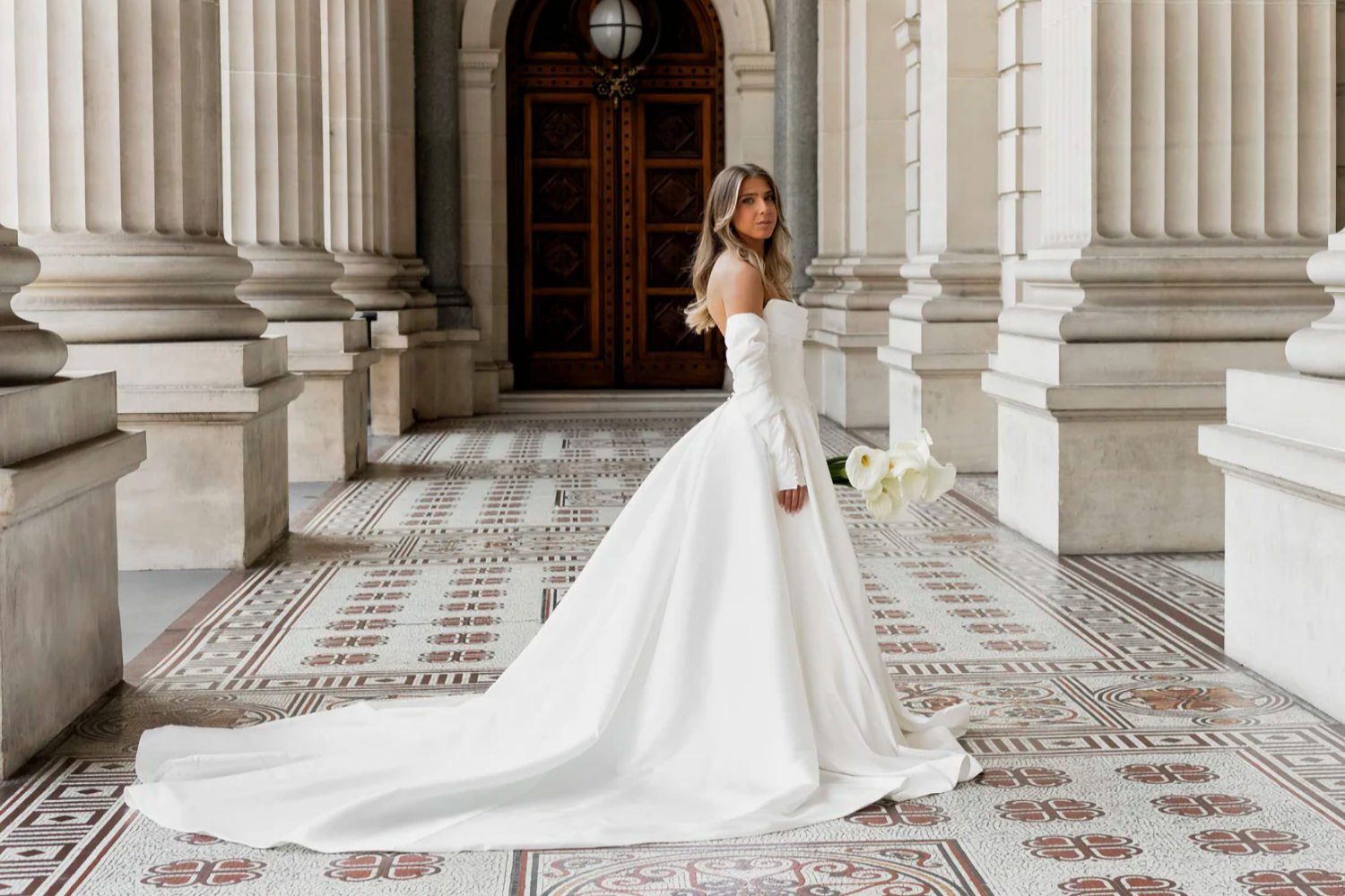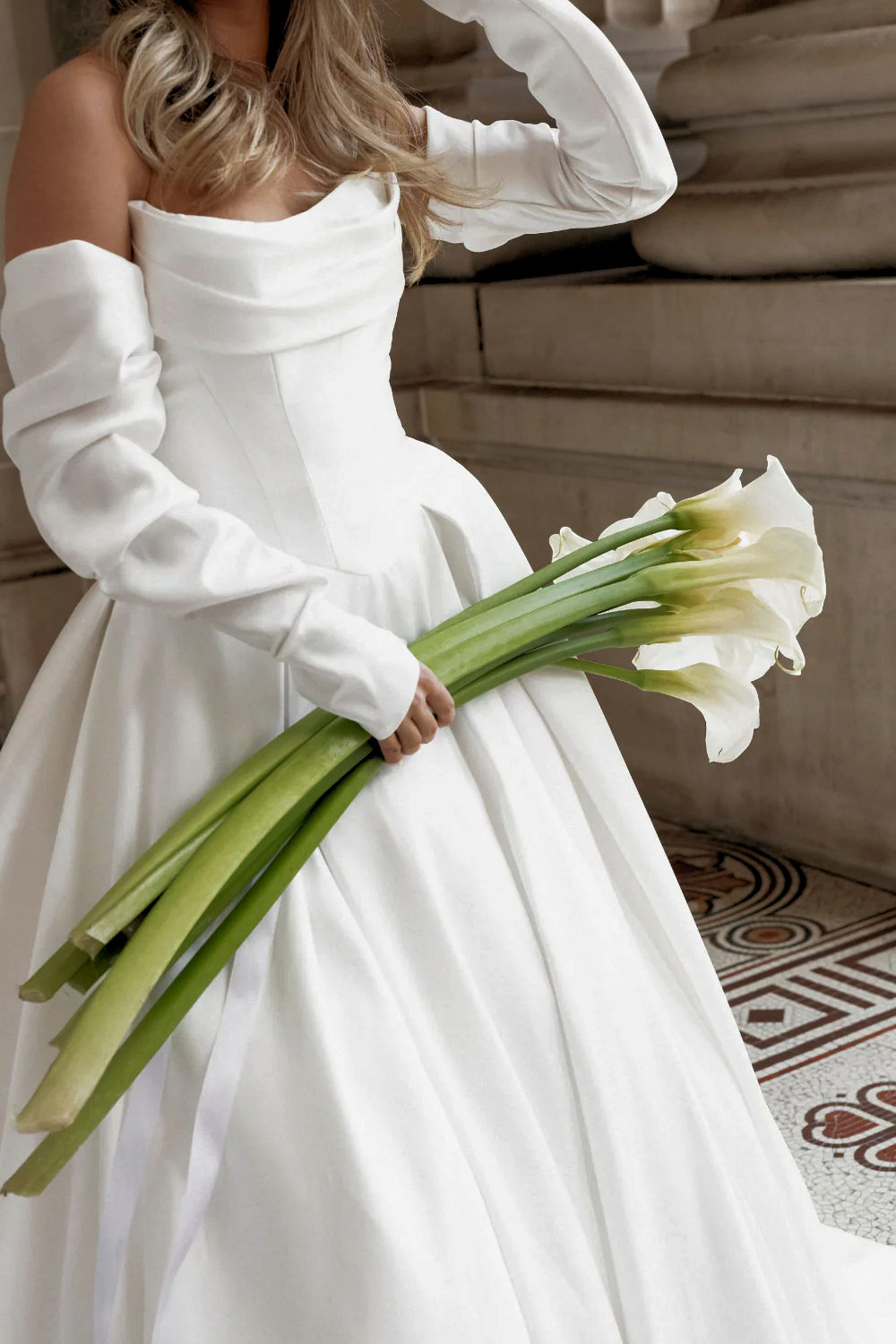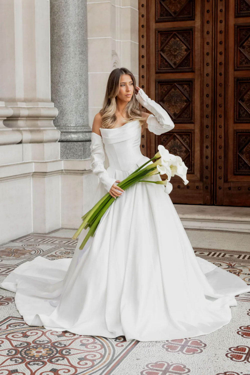 Draped in our finest Mikado fabric, Gina features the ever-popular drop-down waist, a draped bodice with an inner corset and boning for added support, and an invisible zip complemented by elegant buttons. The long, dramatic princess skirt is sure to capture attention, and adding the detachable sleeves enhances its sophisticated allure.Price Guide: $3,000 - $4,999