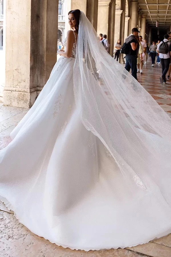 The Gioconda Wedding Gown is the definition of a Princess Silhouette. Created from crinoline, lace and glitter this stunning wedding gown has that wow factor that any bride dreaming of a royal entrance for her wedding day. The bodice is translucent with cups, open back, zipper fastener. The bottom of the skirt is hemmed with crinoline. The translucent bodice features Lace embroidery with glass beads and pearls. Train length is 1m.Price: Original price was: $4,999.00.$3,499.00Current price is: $3,499.00.