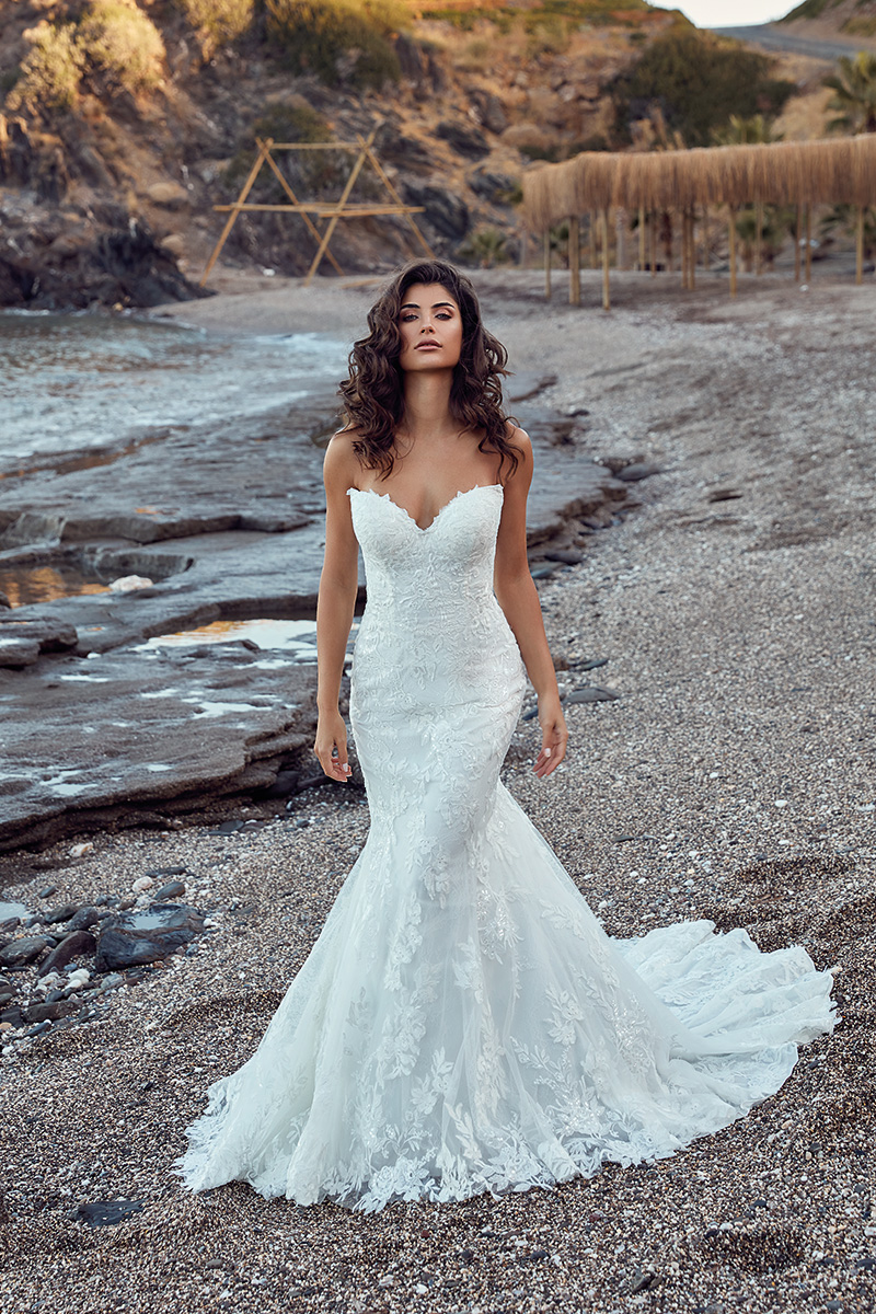 Elegant, chantilly lace wedding dress featuring a cat-eye neckline and buttons to the end of the train.