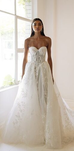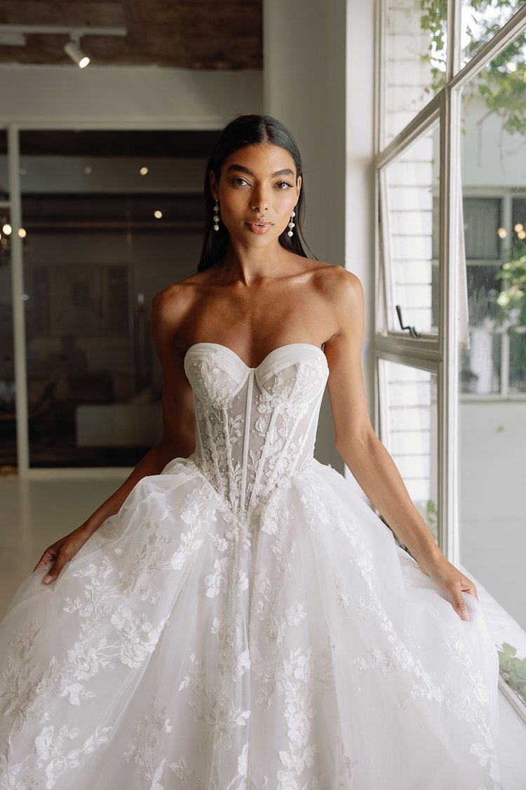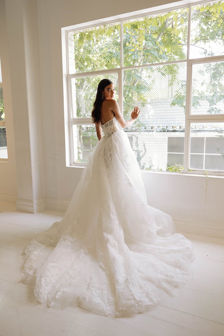 The Greta wedding dress showcases a flattering A-line silhouette with a basque waistline. Adorned with delicate beads and mesh pleats on the bodice, it features intricately crafted laser-cut lace flowers that add a touch of romance to the overall look. This gown beautifully combines elegance and trendiness, making it an ideal choice for the modern bride.Price Guide: $3,000 - $4,999