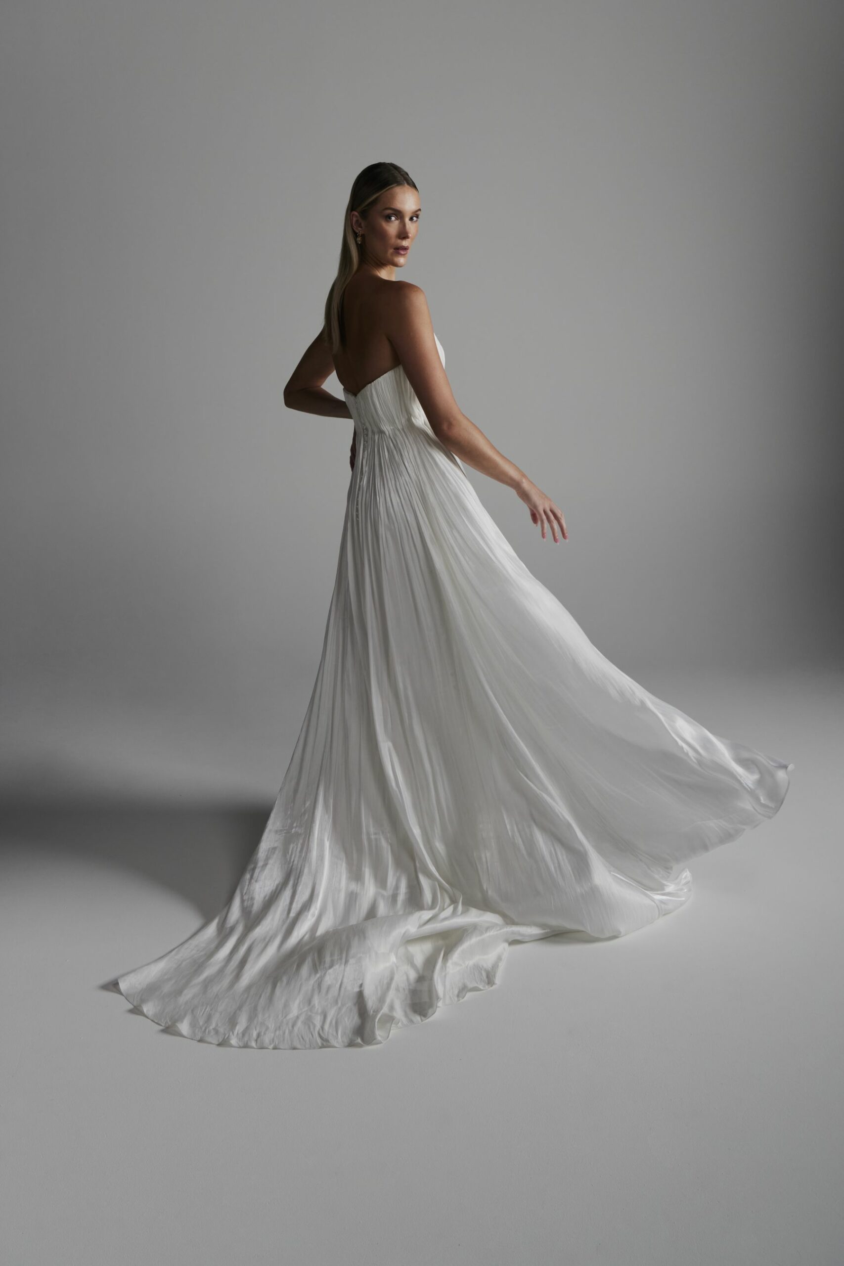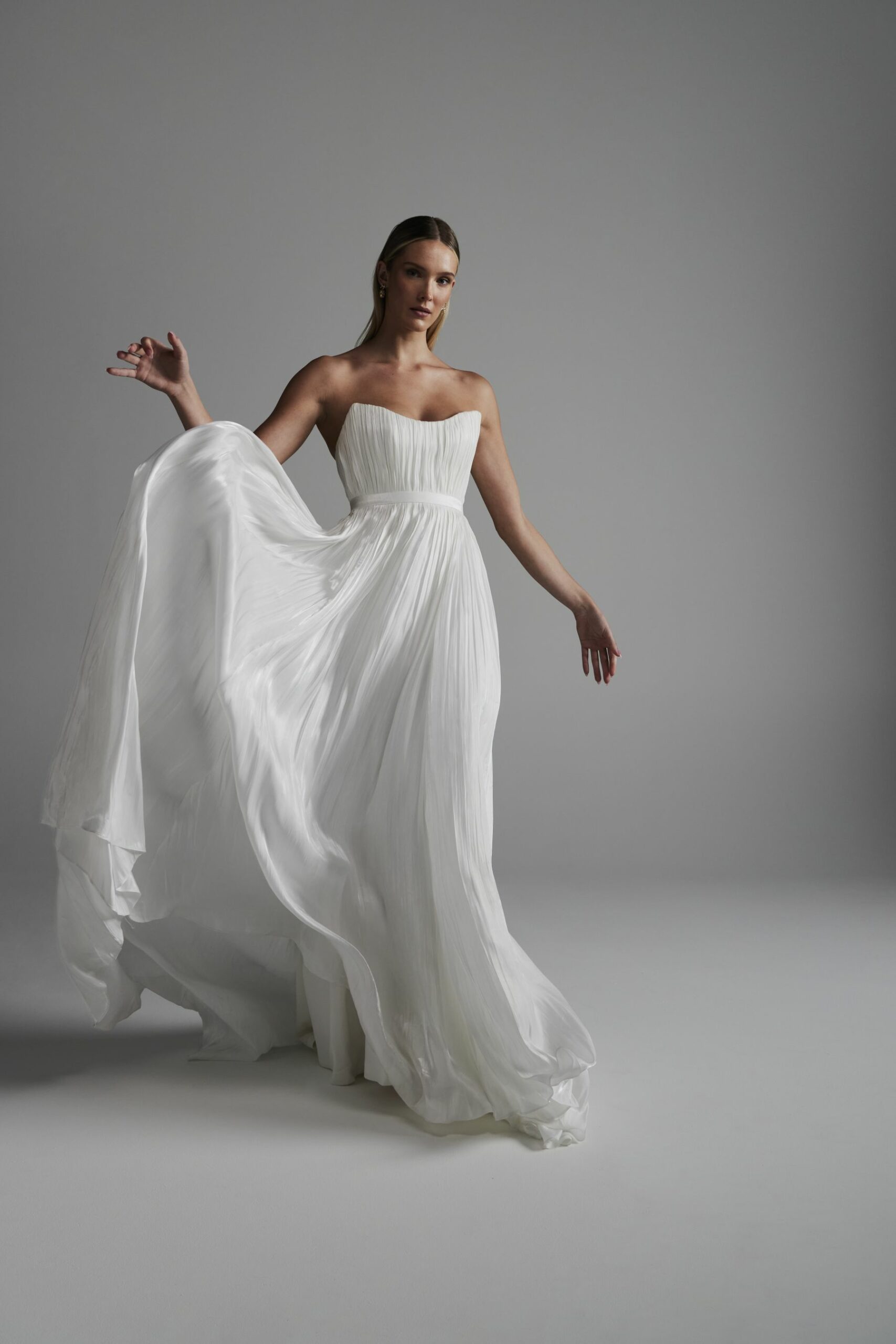 Helix combines statuesque design with joyful movement and moves seamlessly between ceremony and dance floor. Pair with statement jewellery.