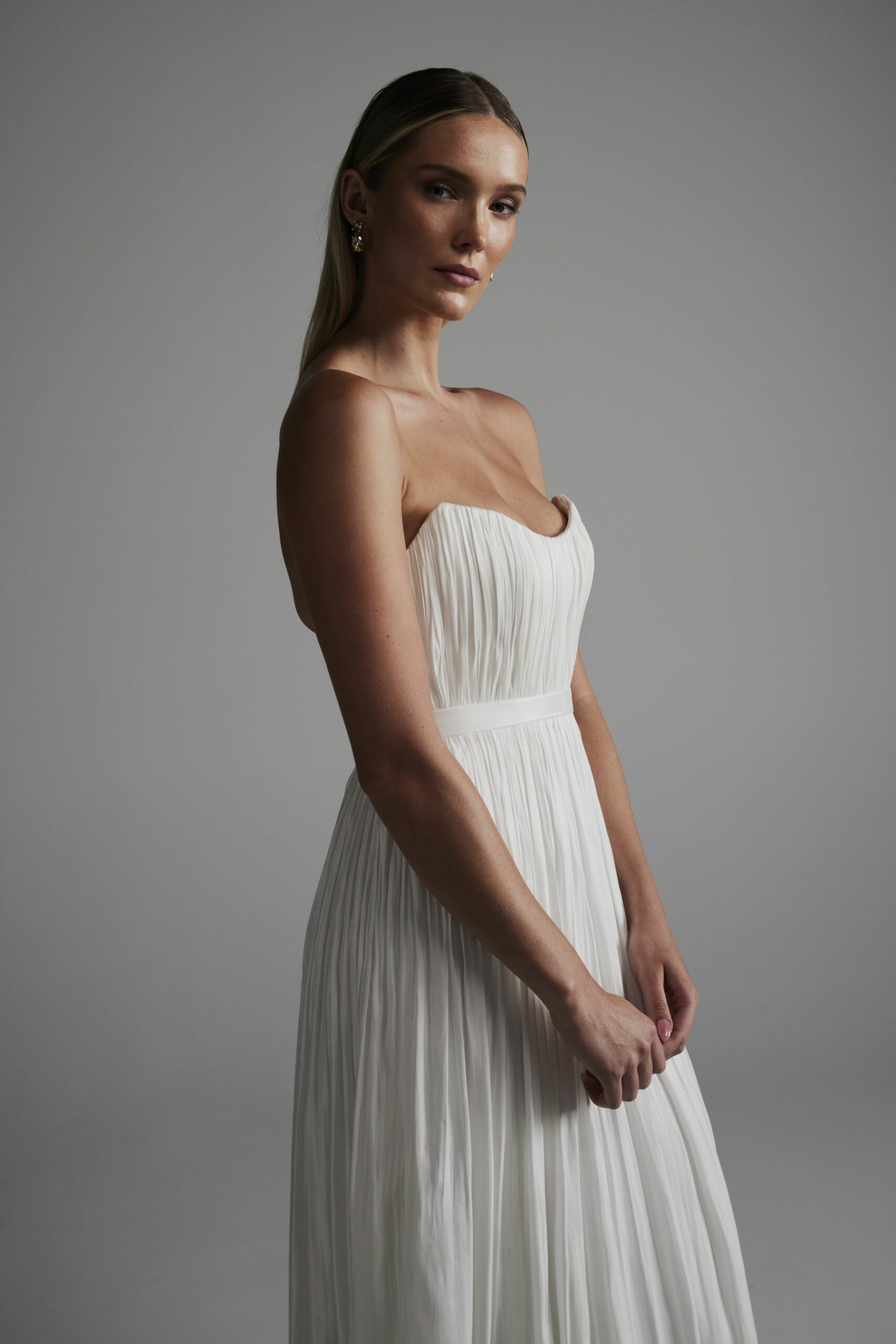 The Helix gown is a masterclass in simplicity. The perfectly proportioned strapless neckline gives a slight hourglass look as the pleated silky satin flows down to the nipped in waist. This classic styling lets the fabric shine, and with nothing to interrupt the silhouette, length and elegance are emphasised. The only embellishments are the faux pearl buttons which close the back to add a touch of tradition.