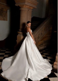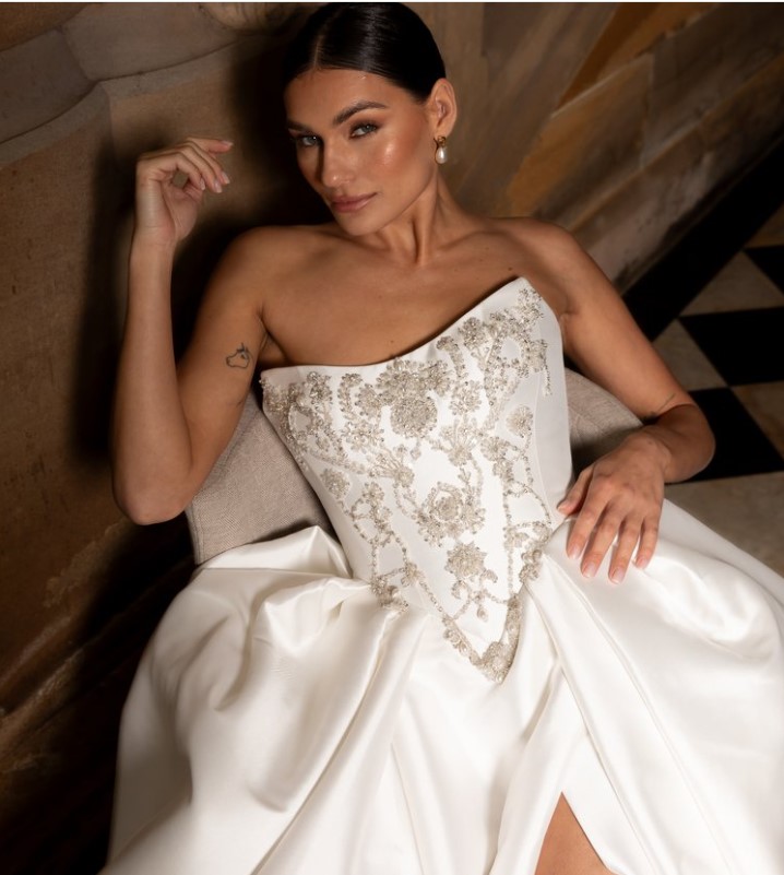 Abbey is a showstopping wedding dress from the La Premiere Couture collection, featuring intricate Indian embroidery and artfully created layers. Crafted from luxe mikado fabric, Abbey blends classic elegance with modern design.