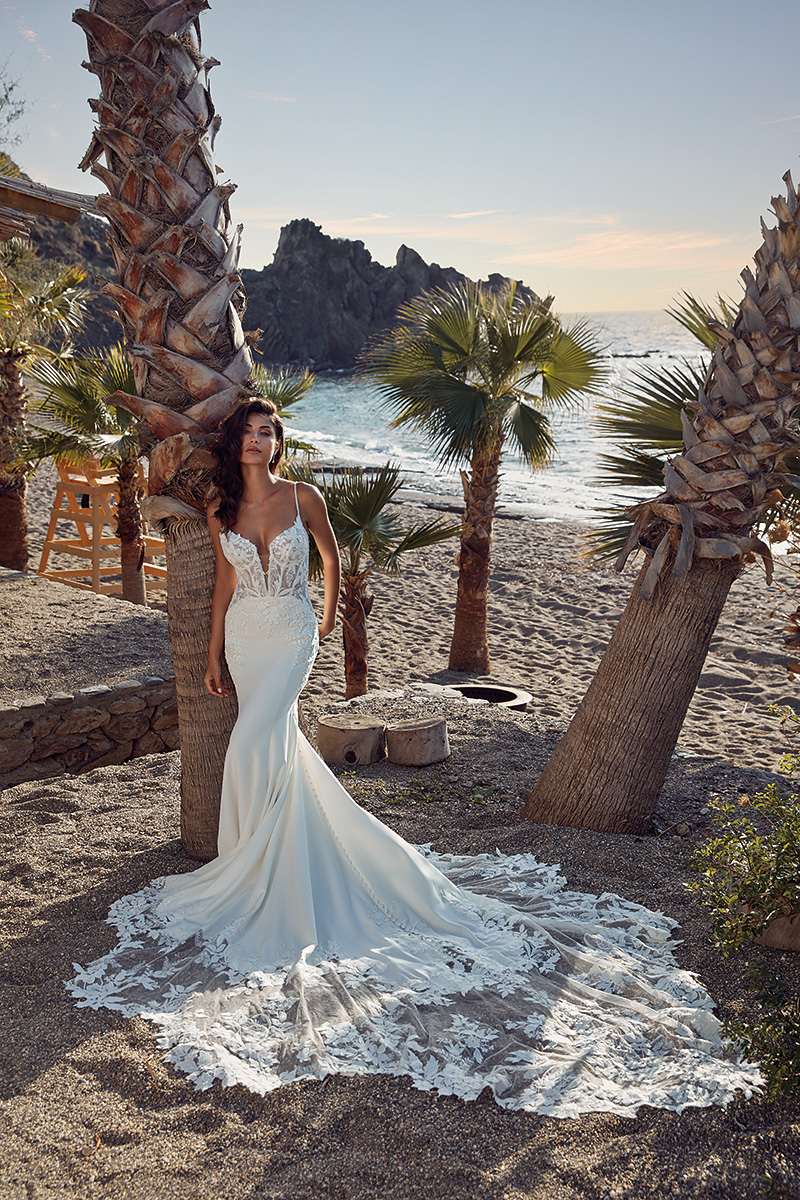 Welcoming Laguna, a Fit-n-Flare crepe gown, beaded ivory lace with sequins, champagne-skin unlined bodice with Chantilly lace, skin unlined back, beaded spaghetti straps, buttons to end of illusion train