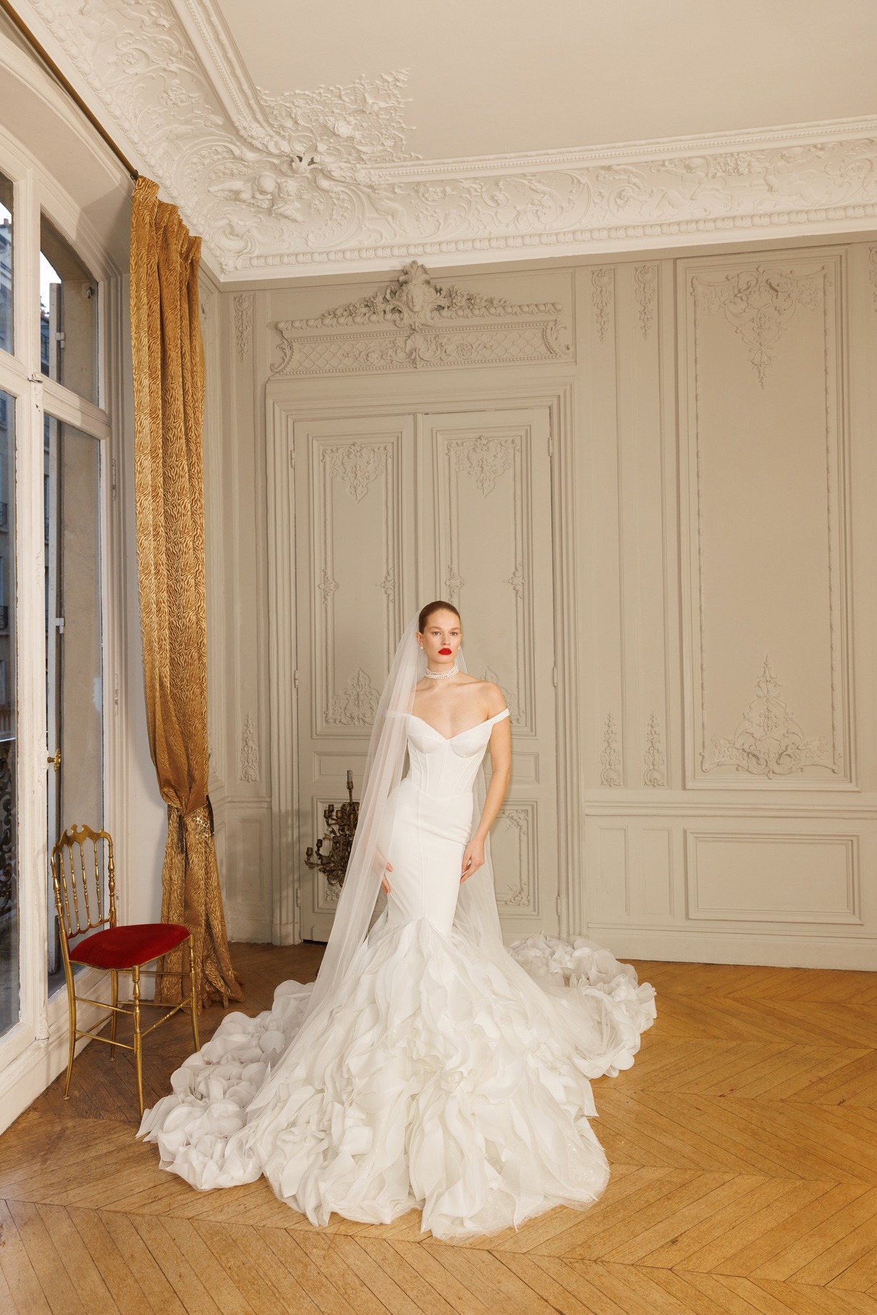 An elegant mermaid-tail to fall in love with. Open-shoulder slightly pointed in the middle neckline and simple structured lace-up top give space to the performance of the 3D appliquès over the bottom of the mermaid-tail. Swirling and waving – the decoration creates a stunning visual effect and makes the dress an ode to femininity and grace. Complemented by the handcrafted veil decorated with the same 3D appliquès at the bottom.Price Guide: $8,000 - $14,999
