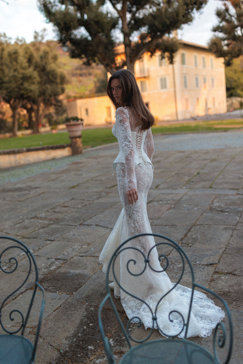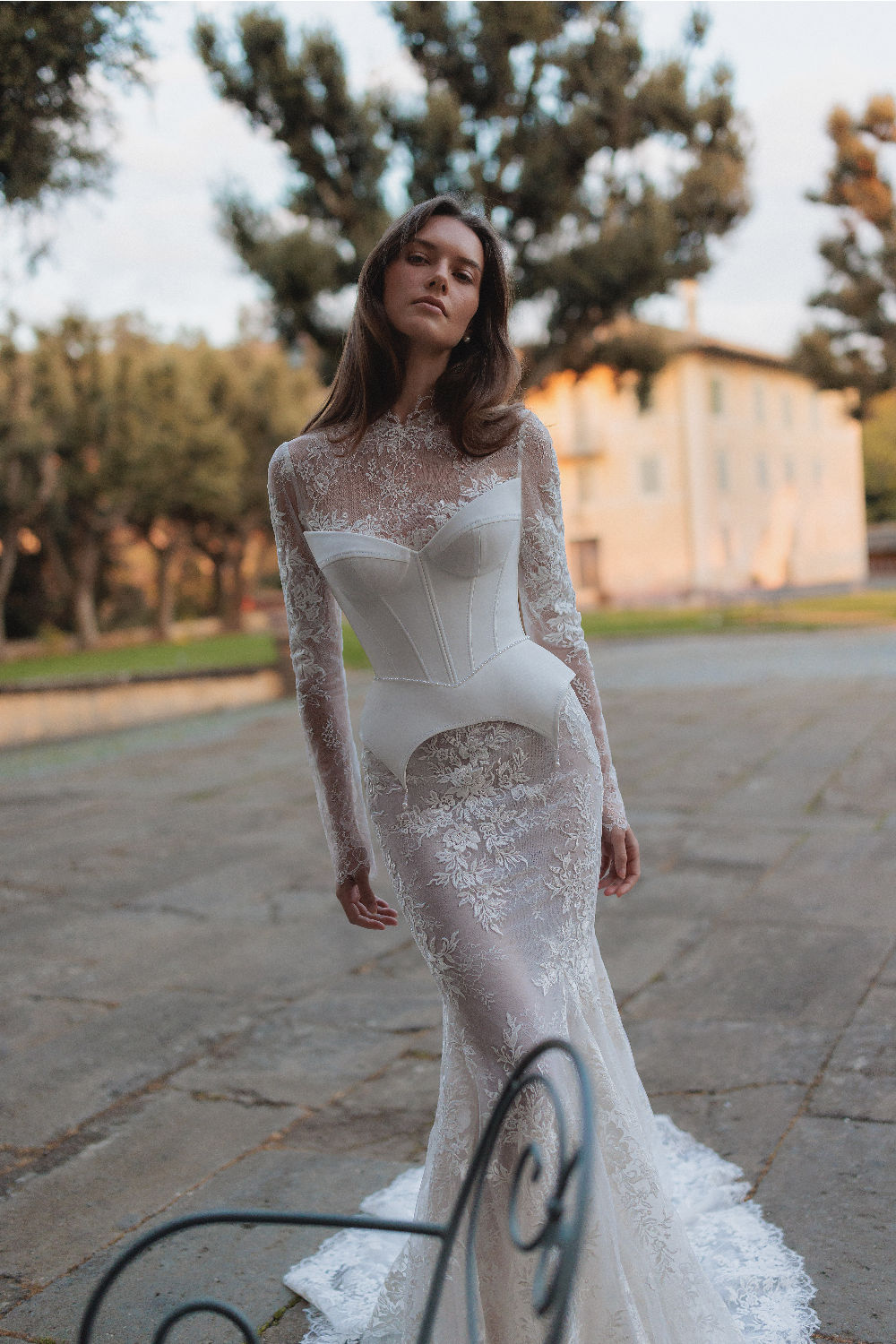 Meticulously detailed embroidery over the translucent long sleeve top and smooth mermaid tail skirt.