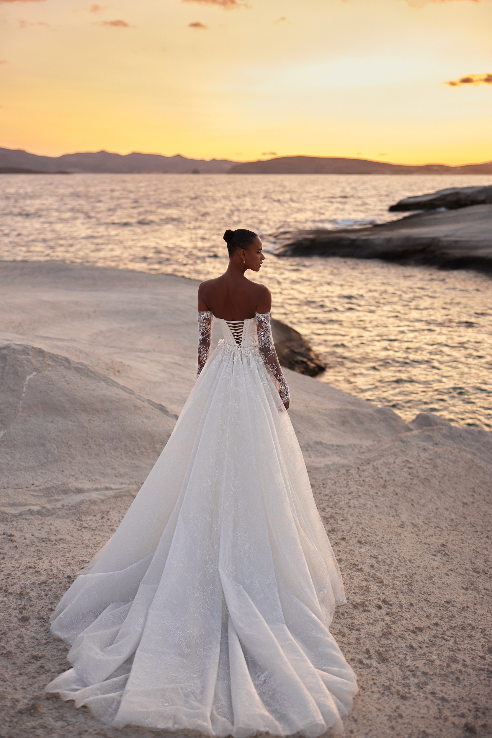 Delicate trumpet dress with a firm corset and a straight rounded neckline. The corset is richly decorated with floral embroideries and shiny beads, with the most emphasis on the waistline, adorned with sophisticated flower applications. The train is voluminous and soft, while detachable lace sleeves complement the outfit, adding even more softness. Gown can be lined or unlined (sample is lined). All accessories sold seperately.