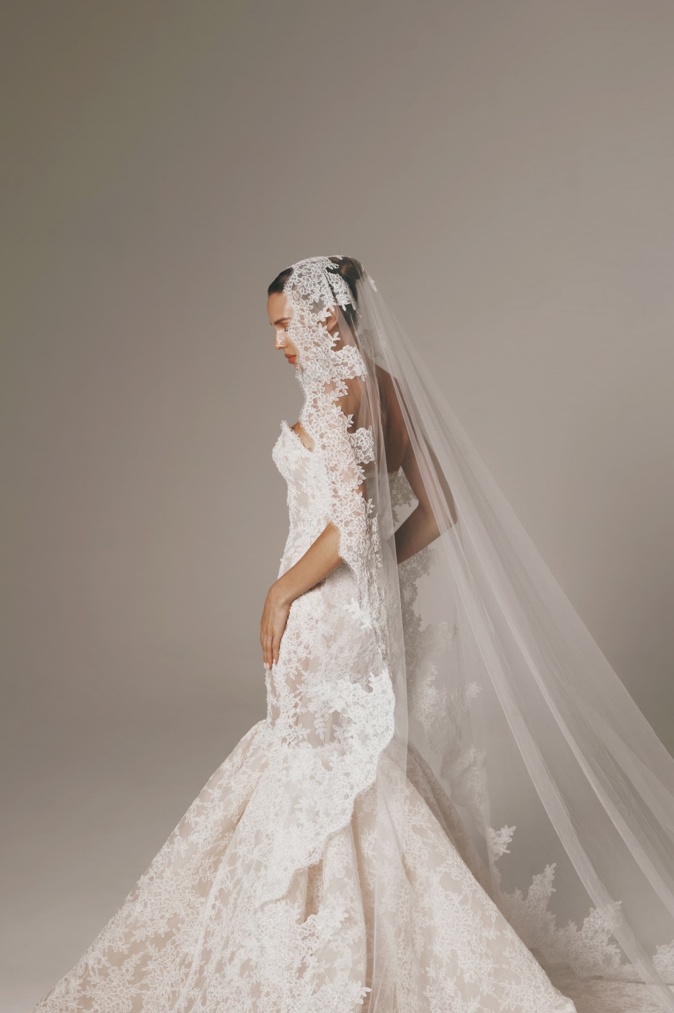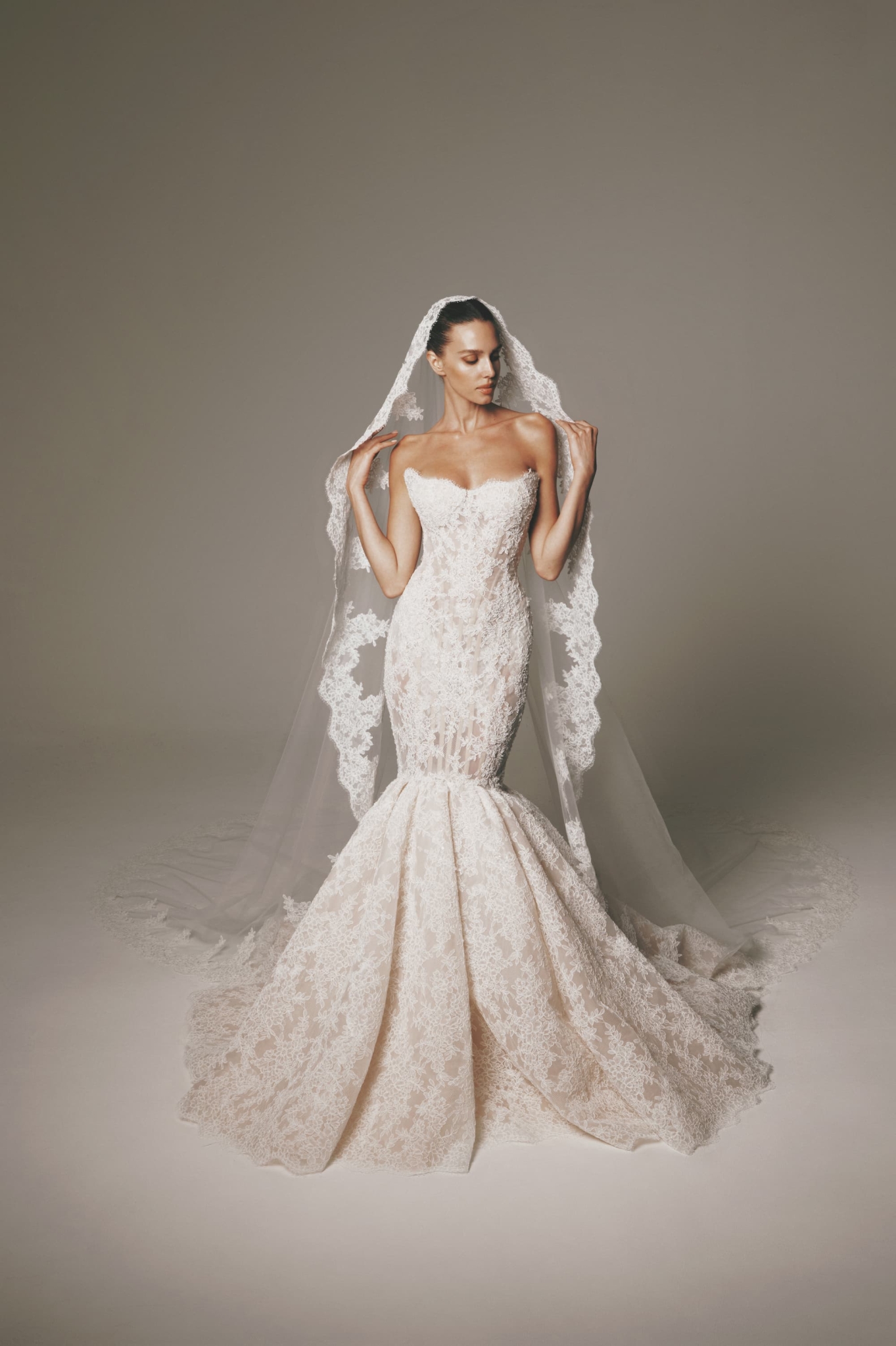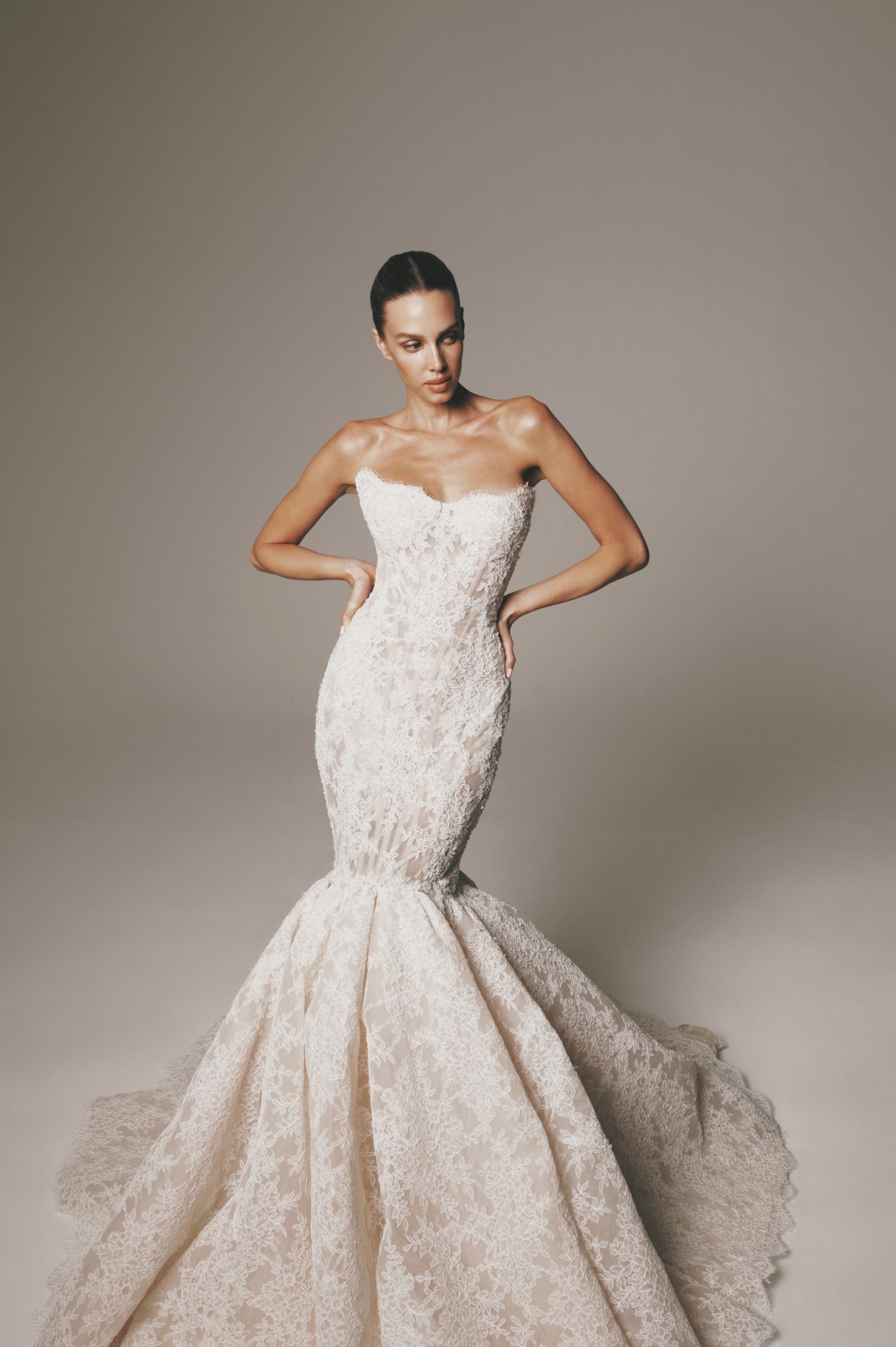 This strapless lace trumpet gown is a striking blend of romance and structure. Featuring a sculpted bodice and fitted silhouette, it flares into a dramatic lace skirt that enhances the figure. Intricate lace detailing is elevated with delicate beading, adding a soft, luminous finish throughout.