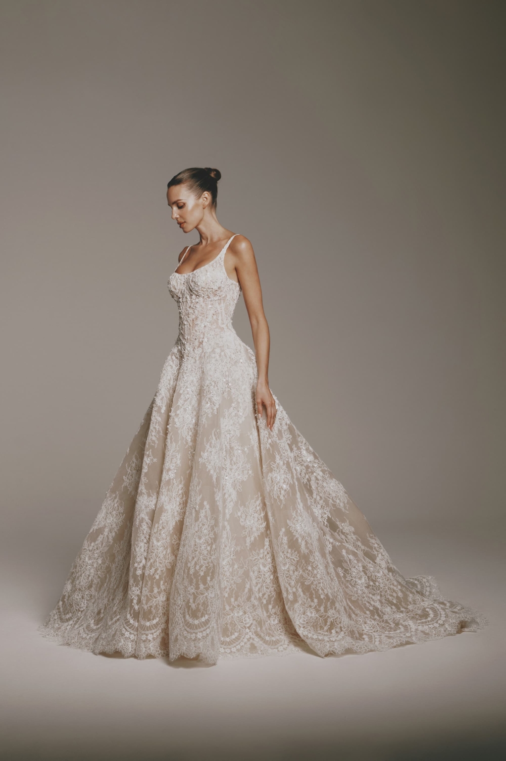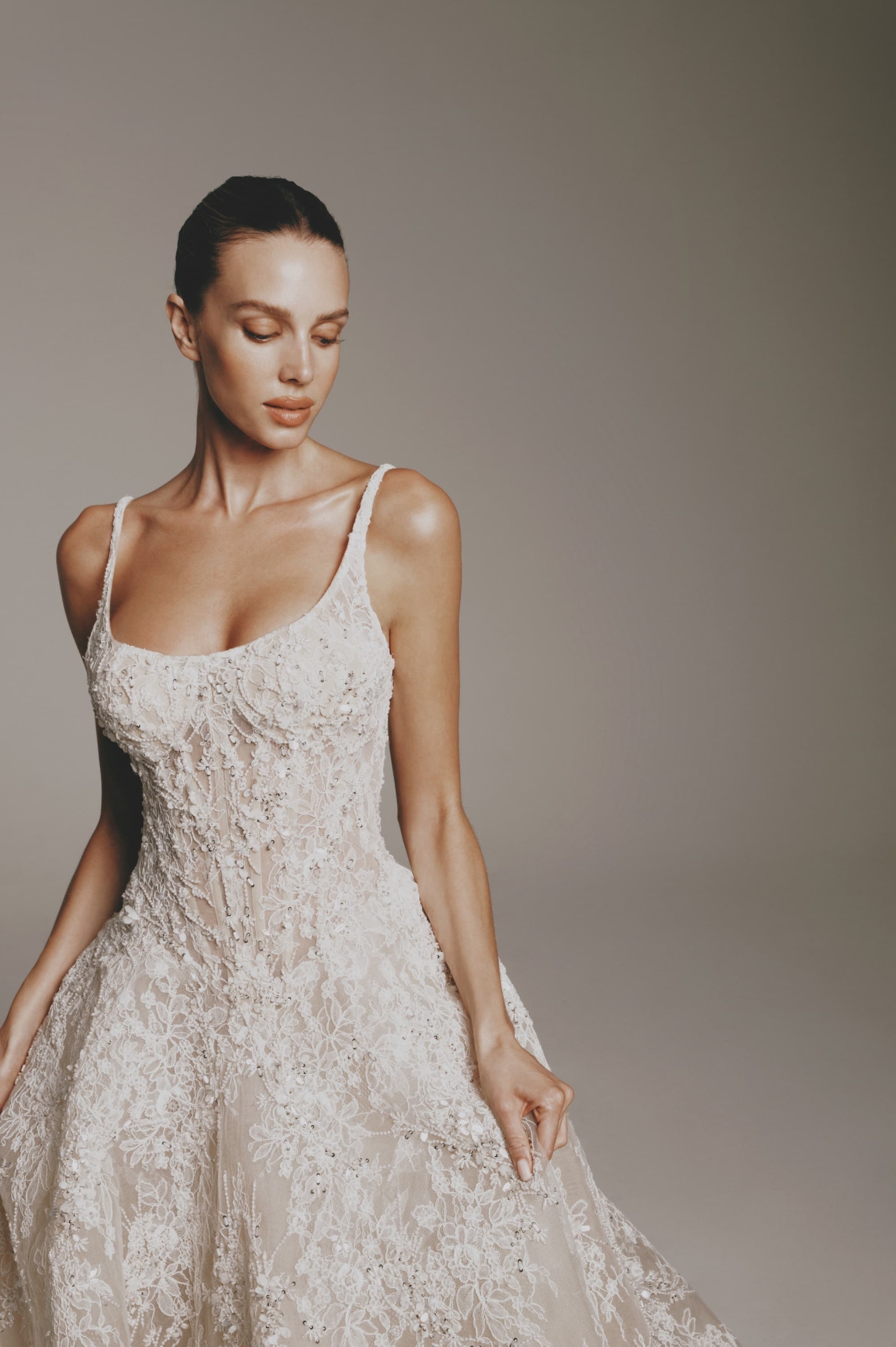 This sleeveless lace gown is a delicate blend of romance and structure. Featuring a softly scooped neckline and a corset-inspired bodice, it sculpts the figure while showcasing intricate lace detailing. Subtle beading is woven throughout, adding a gentle shimmer and elevating the gown’s feminine texture.