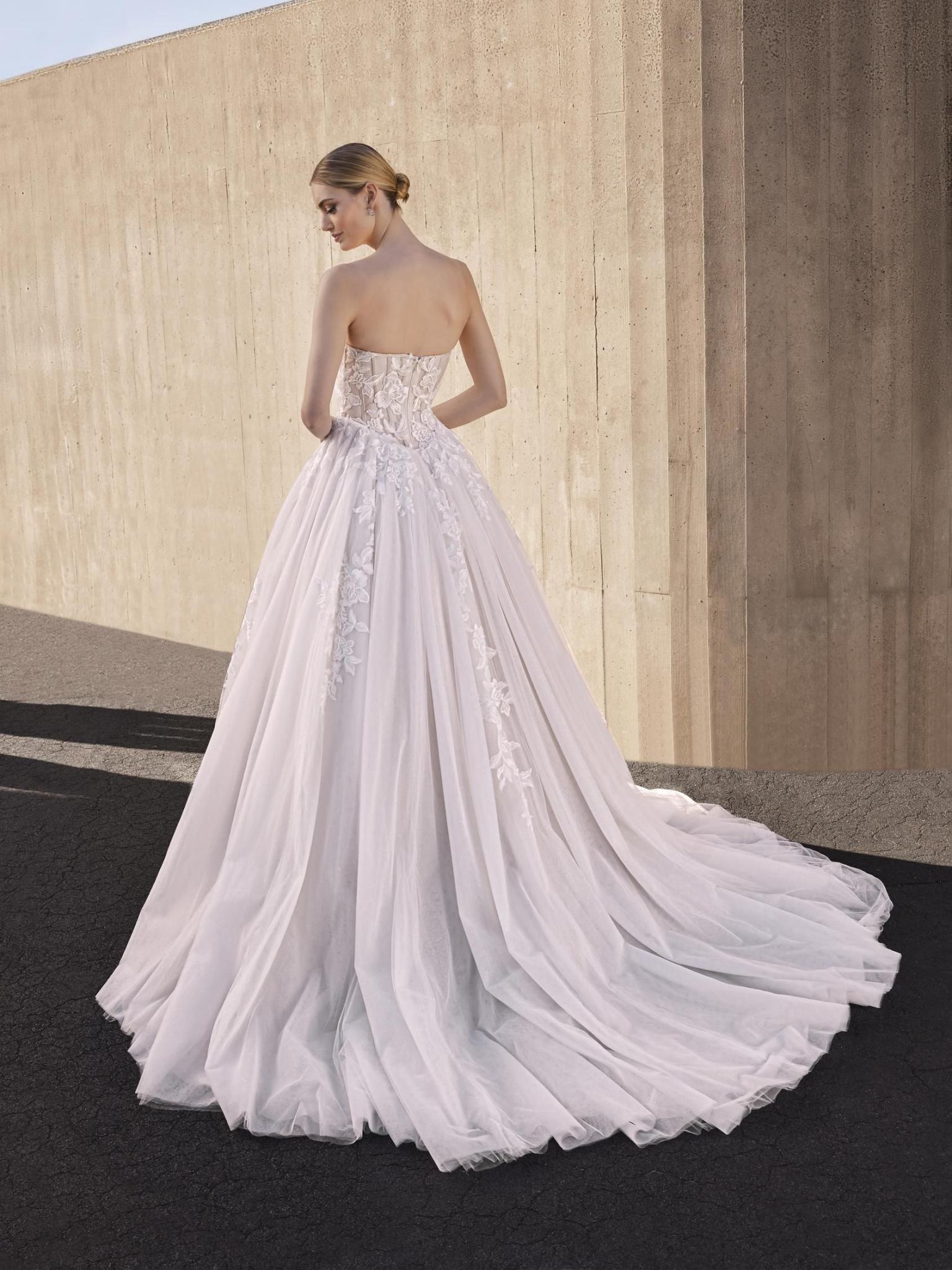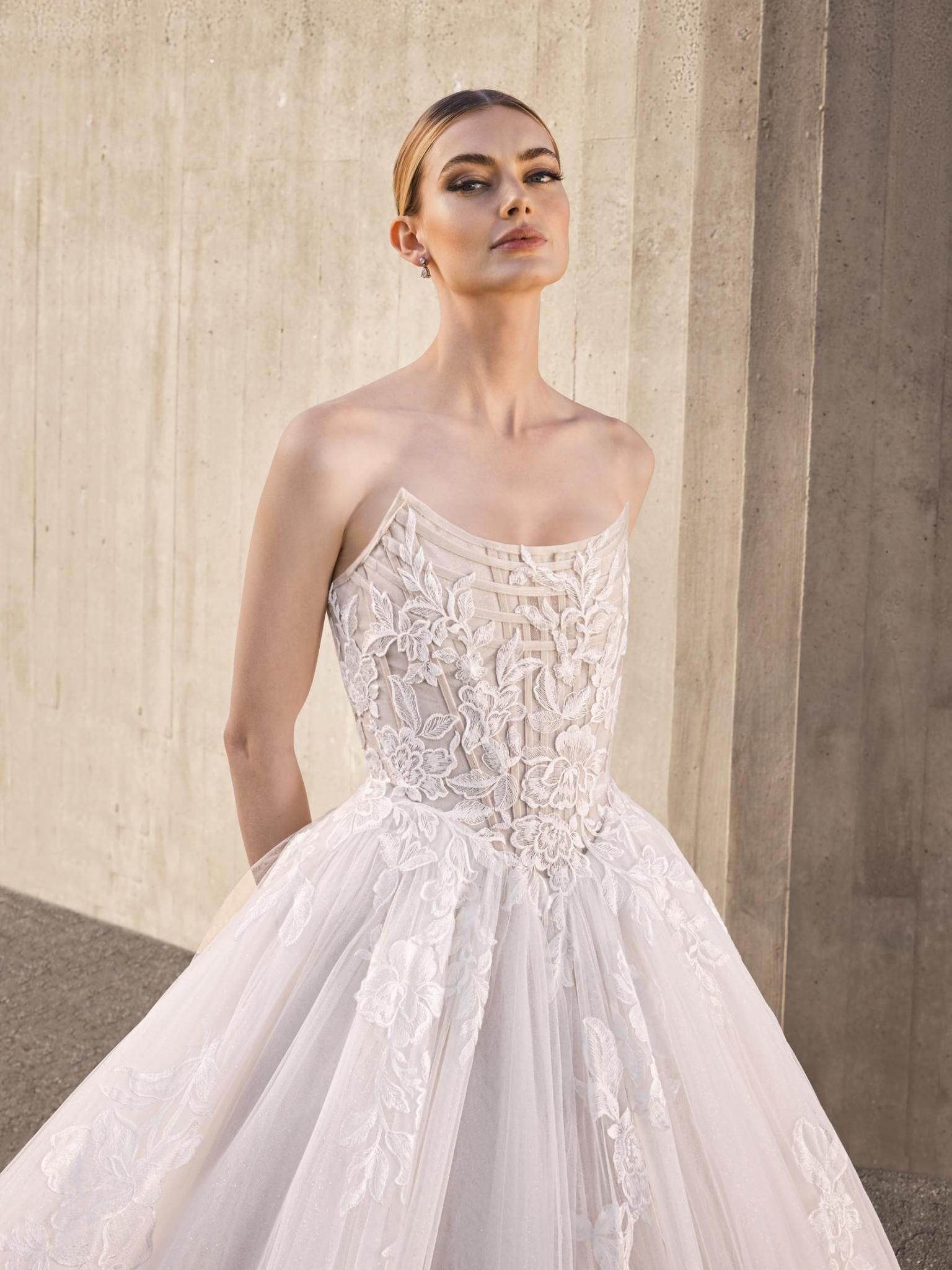 Step into your fairytale moment with the breathtaking Otelia gown by Pronovias, a stunning masterpiece from the latest collection. Designed for the modern bride who dreams of timeless elegance, this strapless ballgown features a romantic illusion corset bodice adorned with delicate floral embroidery that gently cascades into a full, soft tulle skirt. The structured bodice enhances the figure while offering graceful support, and the ethereal skirt flows effortlessly with every step, creating a picture-perfect silhouette from ceremony to first dance. Ideal for grand celebrations, this gown pairs classic bridal charm with contemporary design, making it a standout choice for brides seeking both sophistication and softness. Whether you're planning a luxurious ballroom wedding or an elegant outdoor ceremony, the Pronovias Otelia will ensure you feel every bit as radiant as you look.Price Guide: $3,000 - $4,999