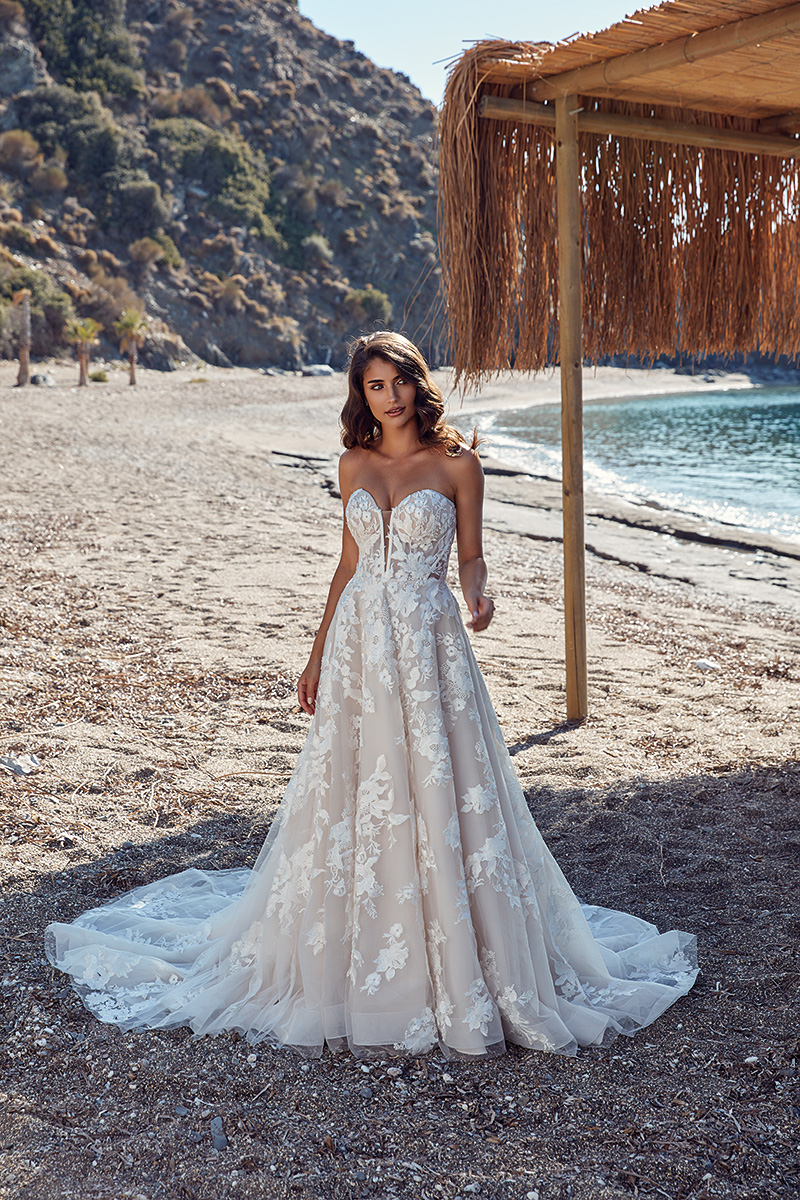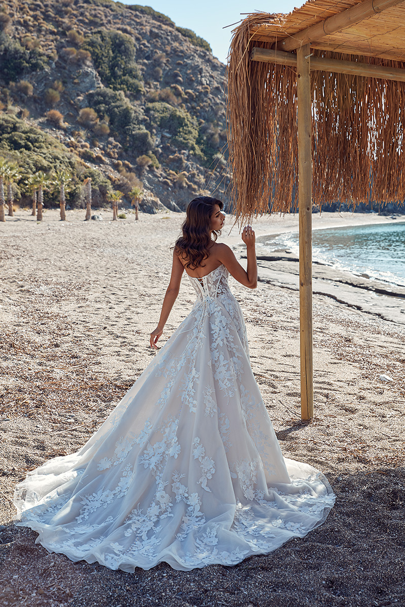 Palmina, an A-Line gown with ivory lace over ivory tulle, champagne tulle, dust matte lining, ivory-champagne unlined bodice with skin unlined sides and cleavage, lace up back, buttons to end of train