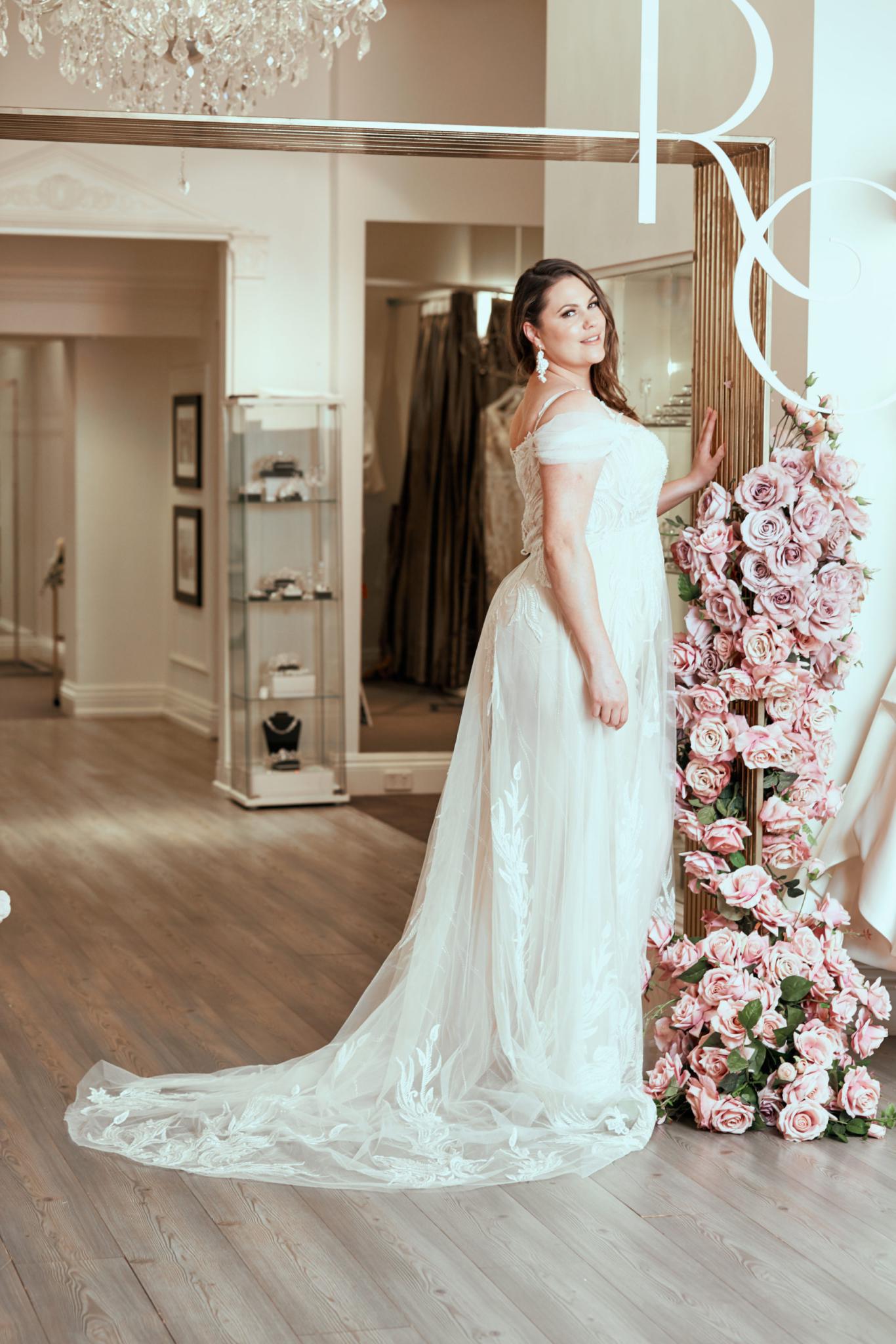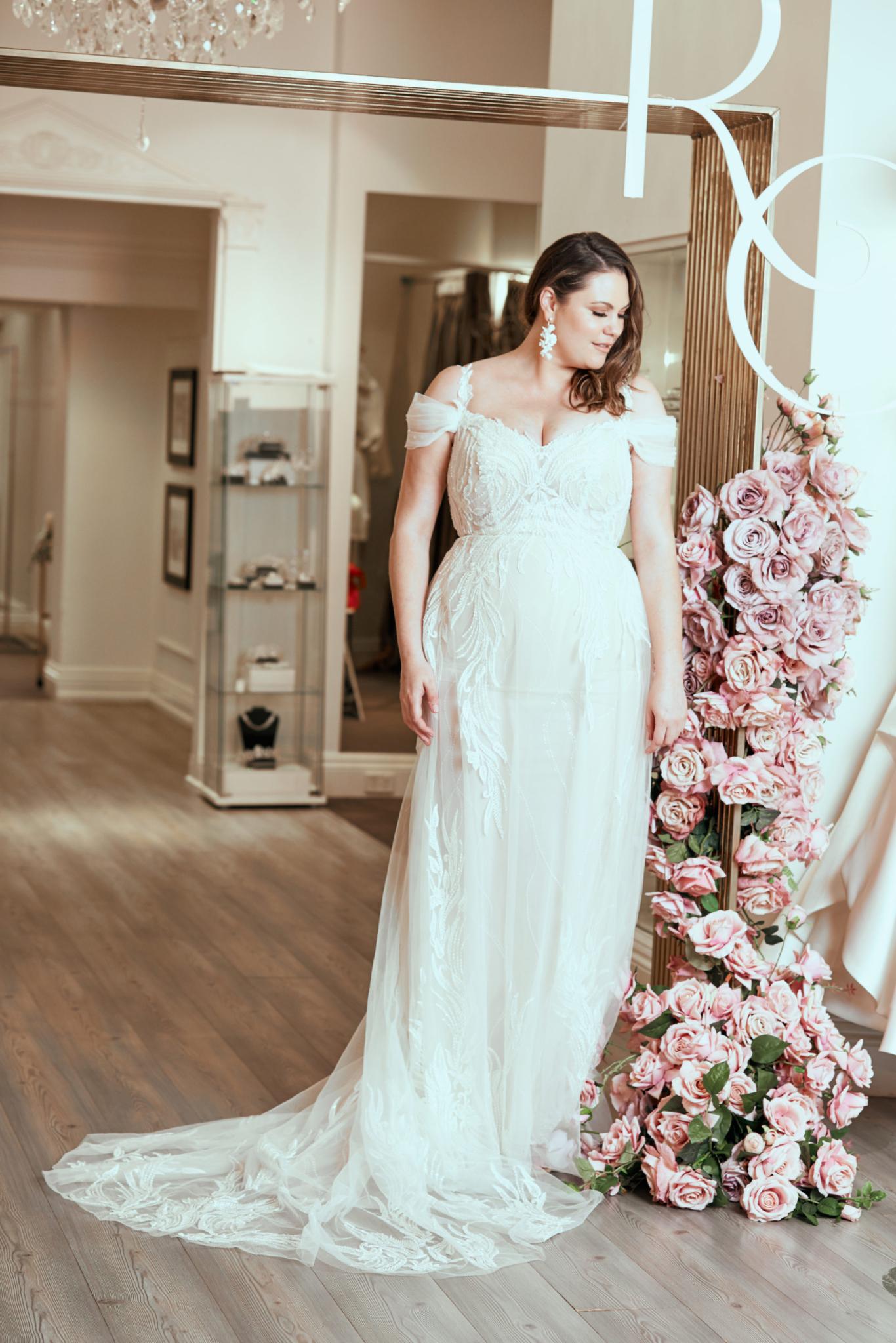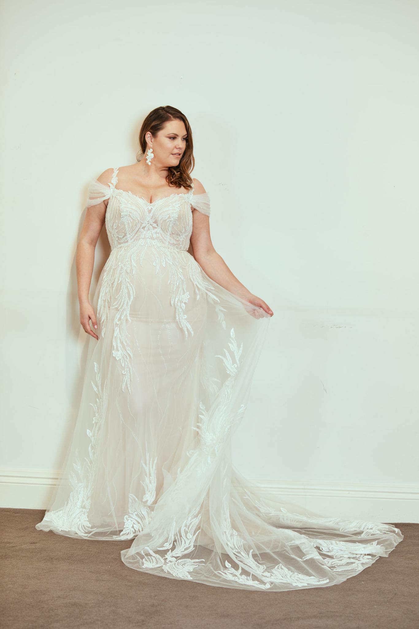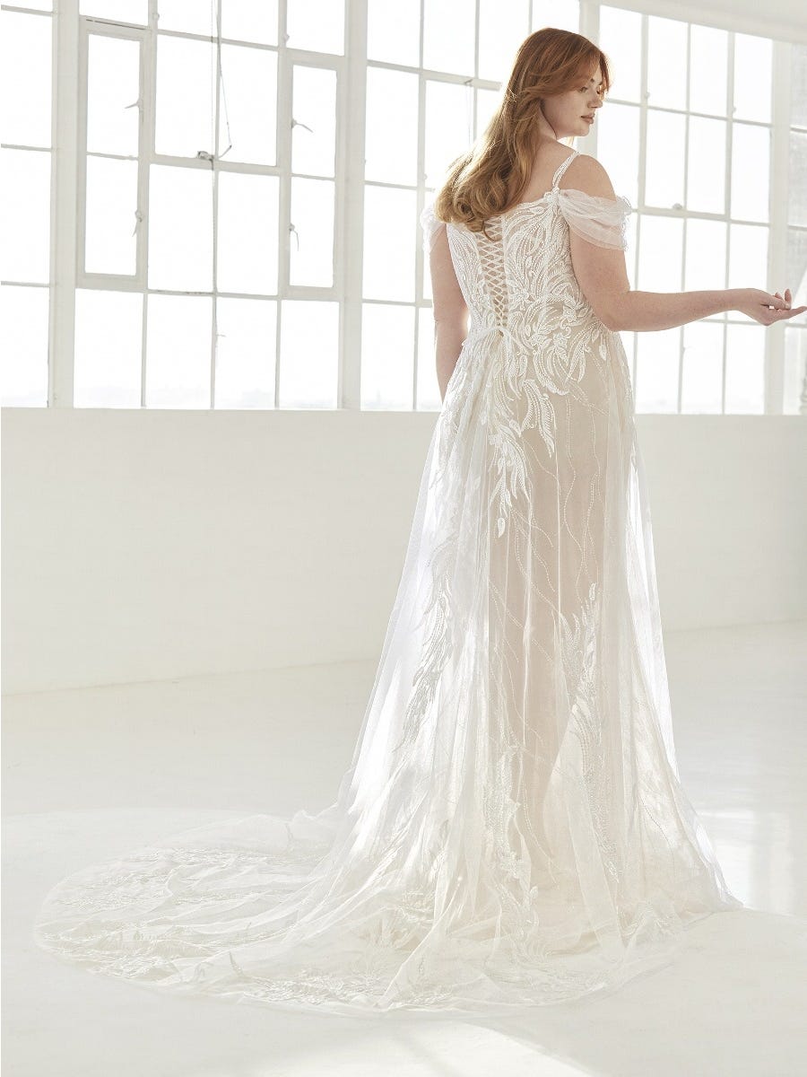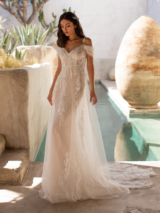 With a chic touch of vintage, the Pronovias Hunter wedding dress is constructed with layers of transparent tulle. This dress is hand-sewn with exquisite embroidery. Detachable sleeves see you from ceremony to celebration.