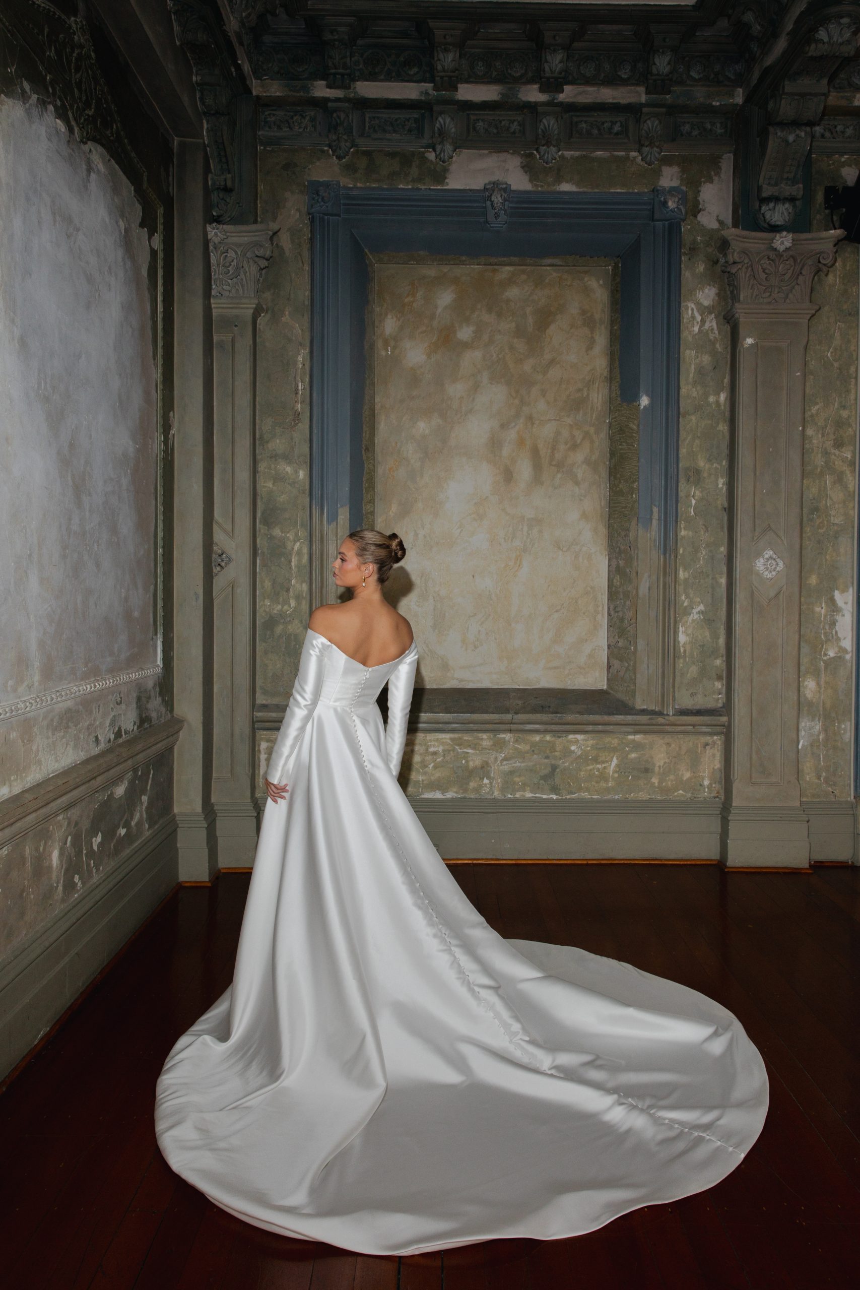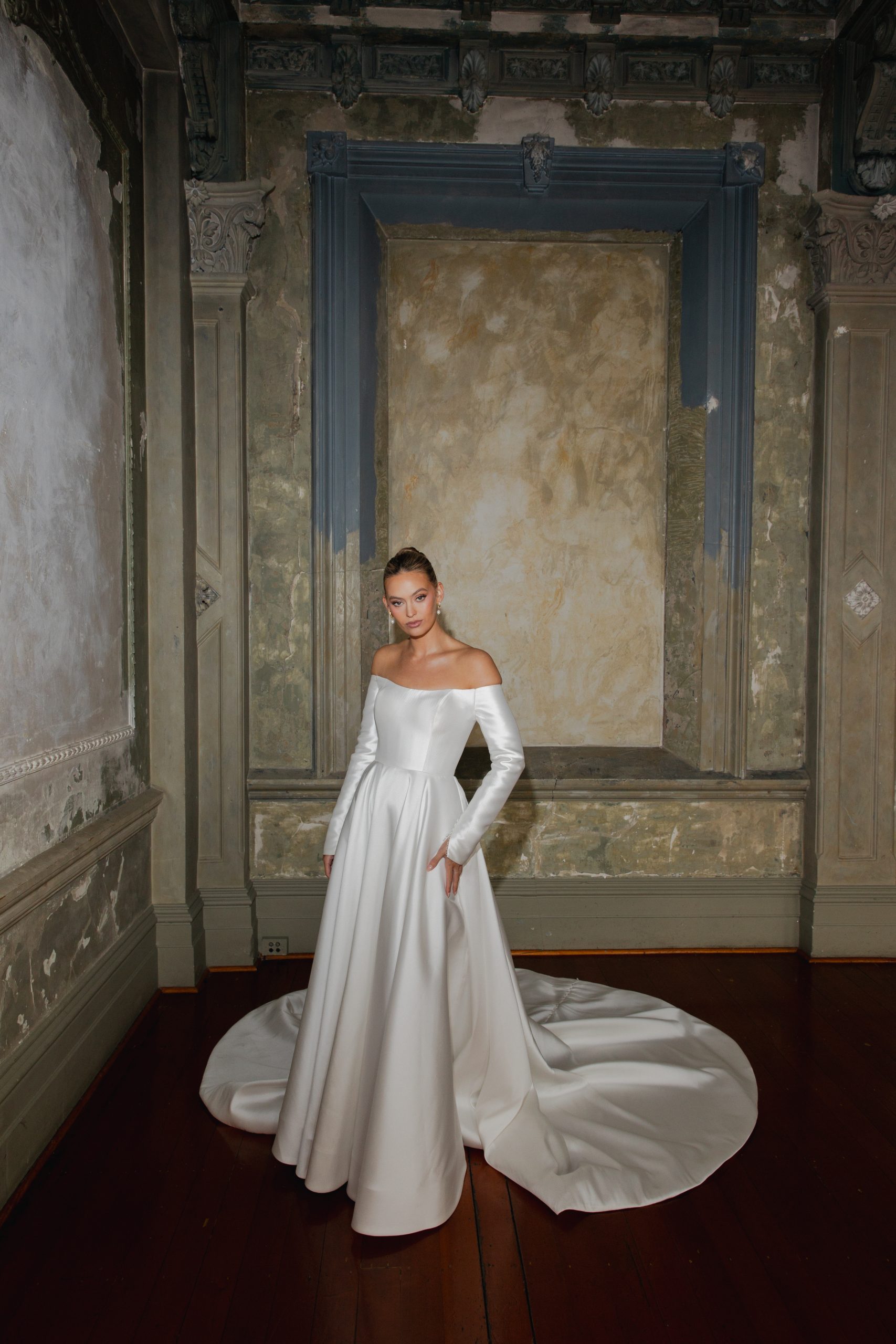 A striking off-the-shoulder satin wedding gown that embodies refined minimalism and modern elegance. Featuring long fitted sleeves, a structured bodice, and a voluminous skirt that flows into a dramatic chapel-length train, this gown offers a regal yet contemporary silhouette. Crafted from luxurious satin, it highlights clean lines and impeccable tailoring, perfect for the bride who values timeless sophistication and effortless beauty.