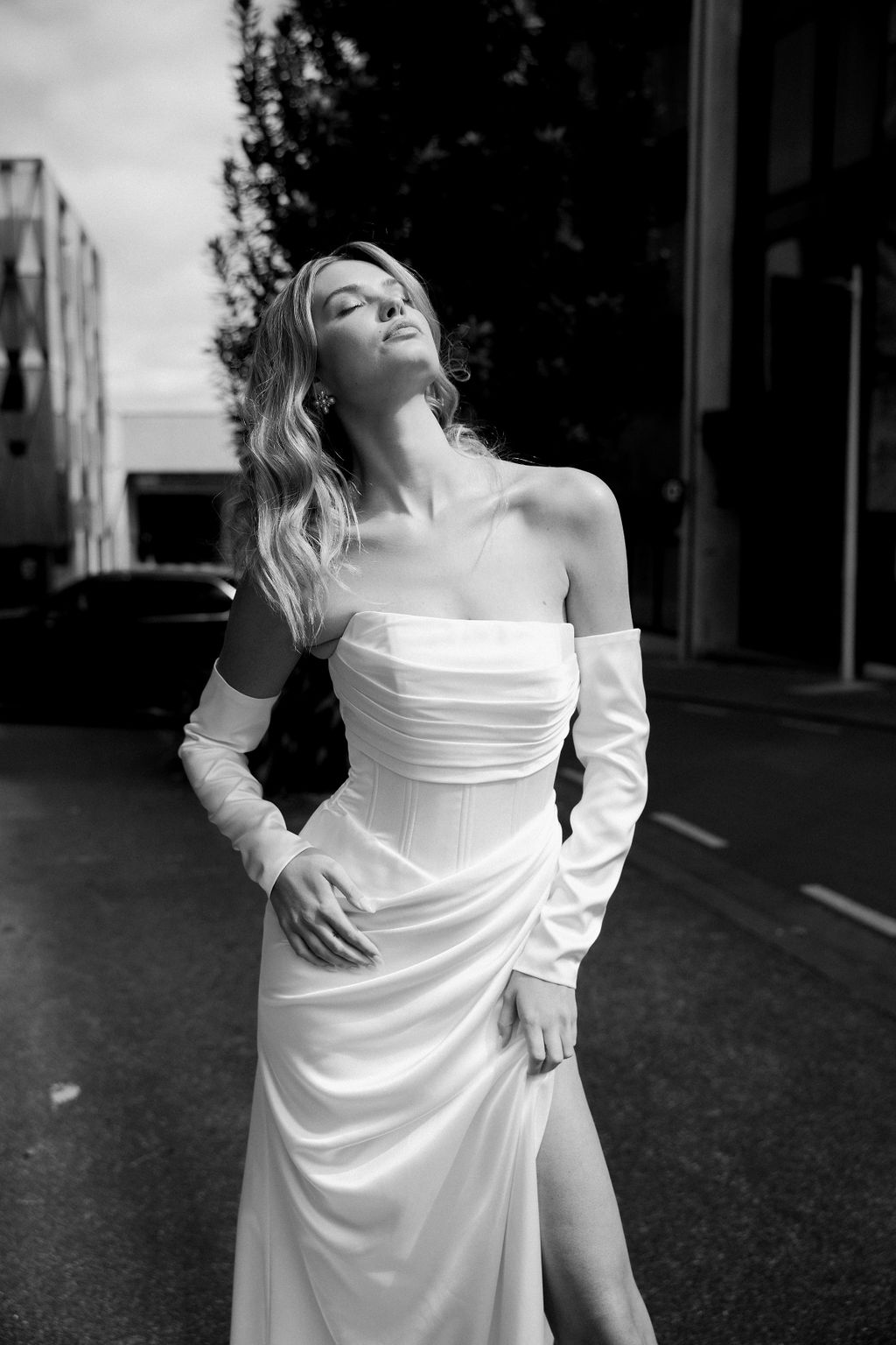 Greek goddess at the front, Art Deco queen from the back, Rochel is the best of both worlds. Made in luminous silky satin this gown glows. The boned bodice is strapless, with pleats folding over the bust, allowing the corset to slim and define the waist. More folds fall across the hip, and form a high split. Detachable sleeves feature a pearl cuff and add opulence to this golden era look. The back showcases rows of meticulous pleats in a subtle V that follows the figure, while a row of faux pearls down the slender skirt and sweep train finishes this gorgeous look.