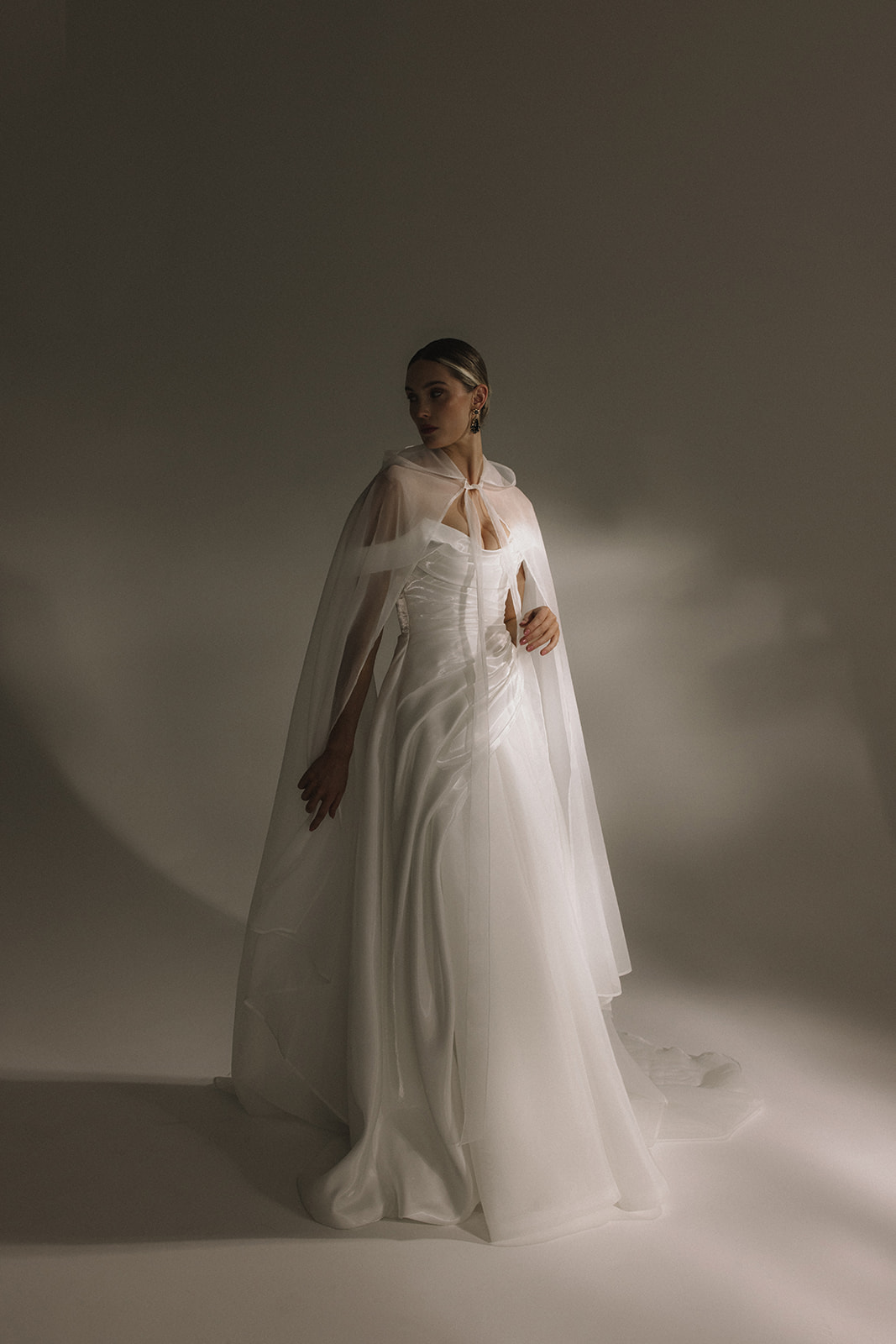 Straight out of a fine art painting or an awards ceremony, the exquisite Serana gown exudes luxurious opulence. Crafted from glazed mikado the expertly draped fabric glows as it skims the bodice to form asymmetrical pleating across the hips for a breathtaking ball gown silhouette. Off-the-shoulder sleeves and a small cowl neck flow gracefully to the back and are closed with a row of pearls that cascade down the length of the train. Serena is a dream come true for the discerning bride and can be elevated further with an ethereal organza cape.