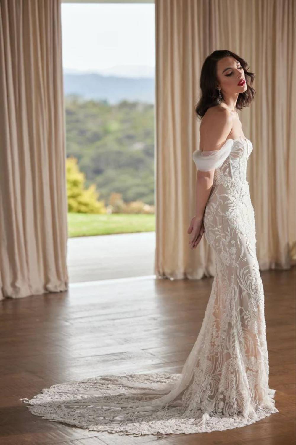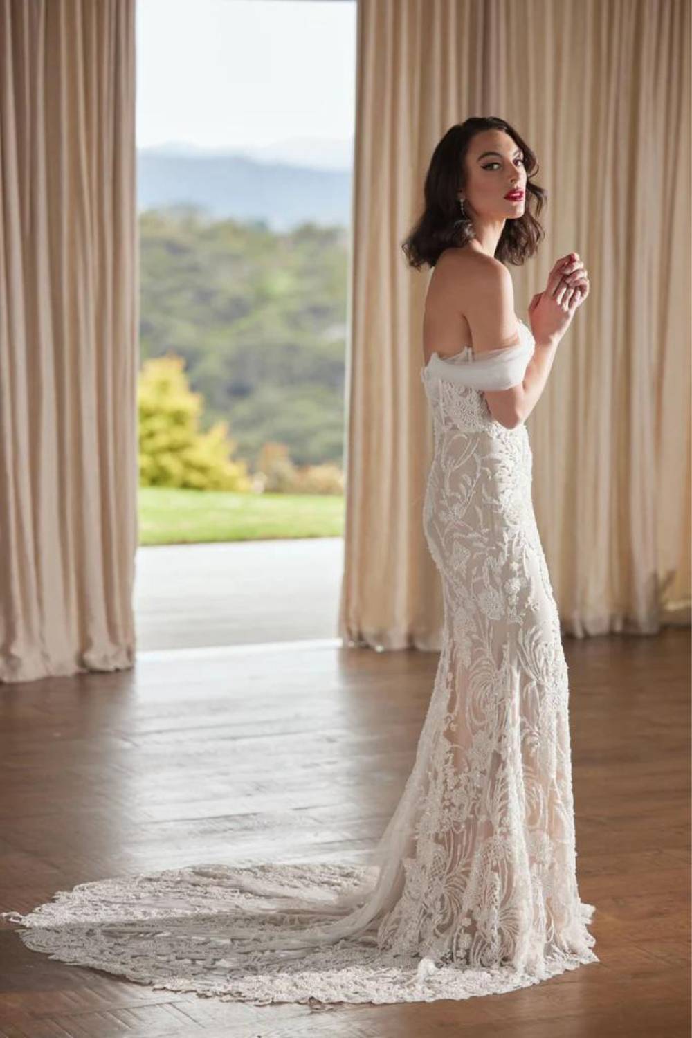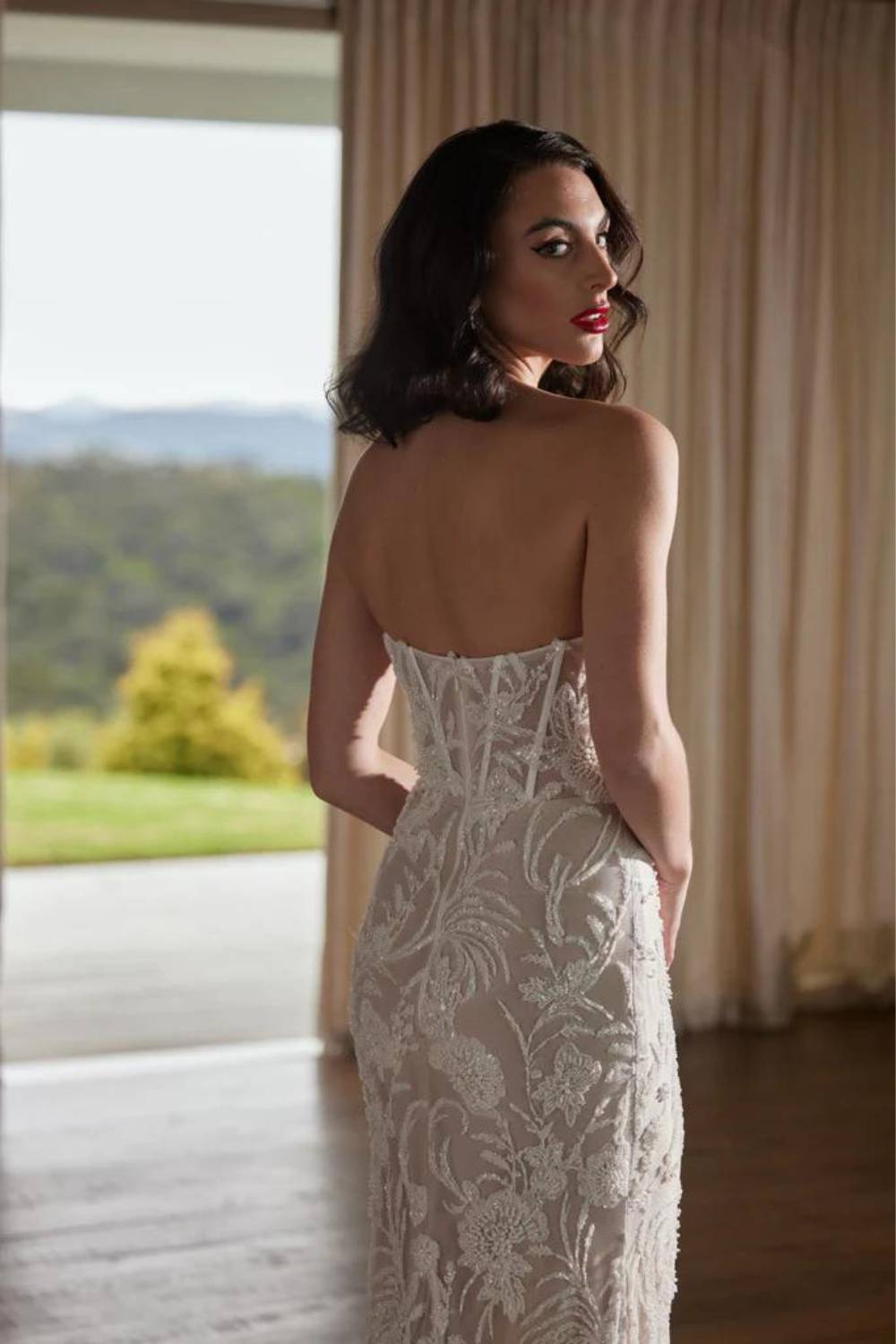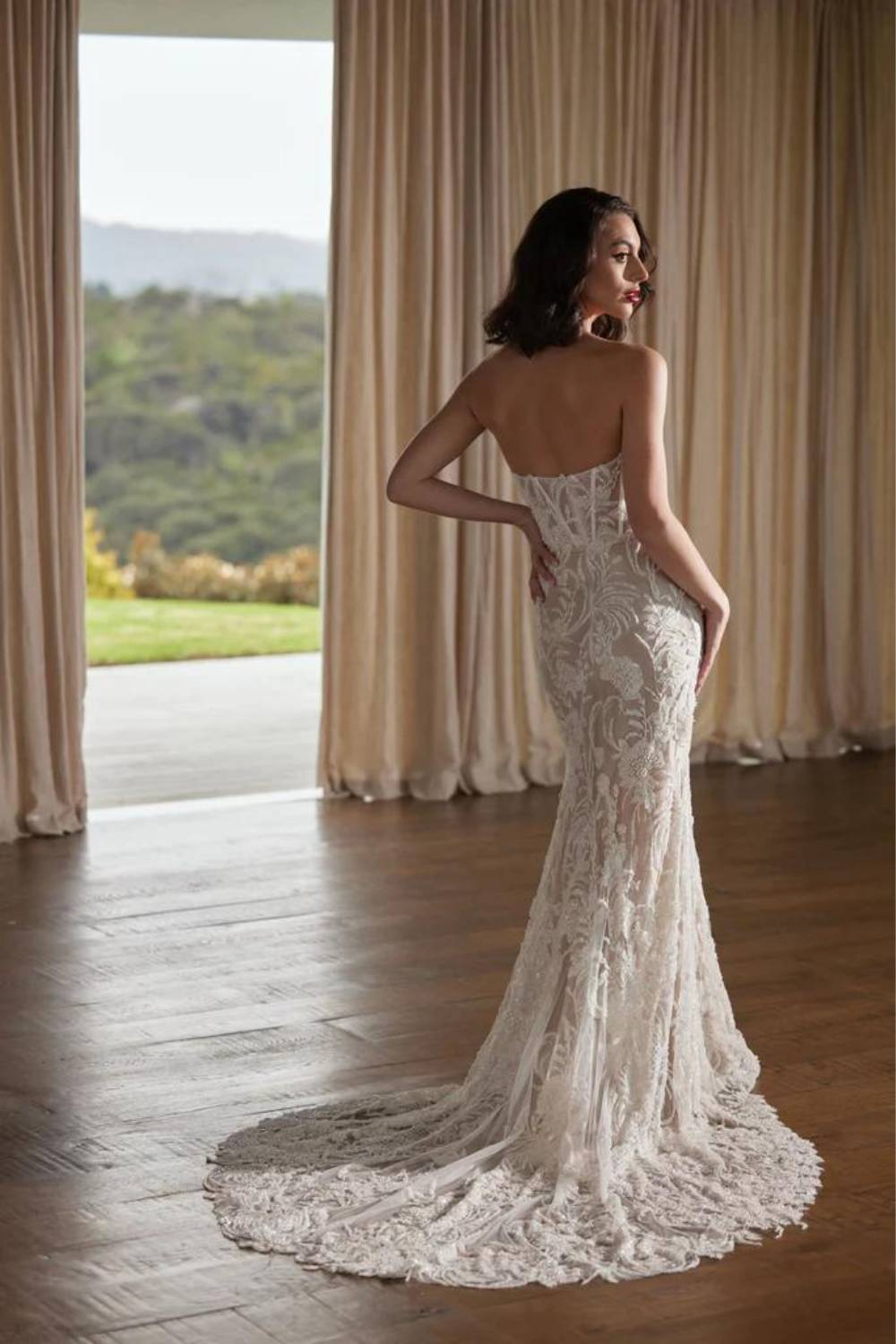 The Tay Wedding Dress showcases a sheath silhouette that is accentuated by a striking floral beaded pattern through out the whole gown. Her sweetheart plunge to waist neckline emphasises an hourglass figure, highlighting a small waist, as her skirt skims and hugs the hips, flowing into a stunning chapel length train. Tay is simply breath-taking.Price Guide: $3,000 - $4,999