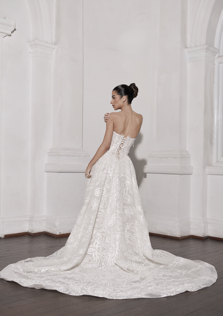 Magnificent strapless a-line gown features a beautifully structured bodice with exposed boning. The entire gown is exquisitely adorned with intricate lace appliques and flows into a grand, full skirt.
