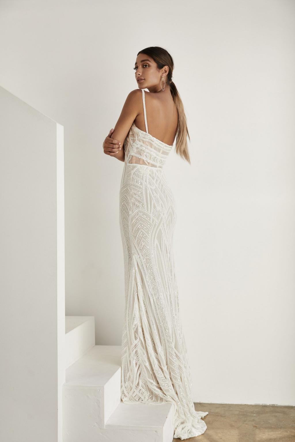 The Zavana Couture 266 wedding dress is a modern masterpiece created for a bride who wants to stand out. This design showcases a fully beaded silhouette in a design reminiscent of the most striking architecture. The sweetheart neckline is flanked with beaded spaghetti straps that extend onto the low open back.Price: Original price was: $4,599.00.$3,199.00Current price is: $3,199.00.