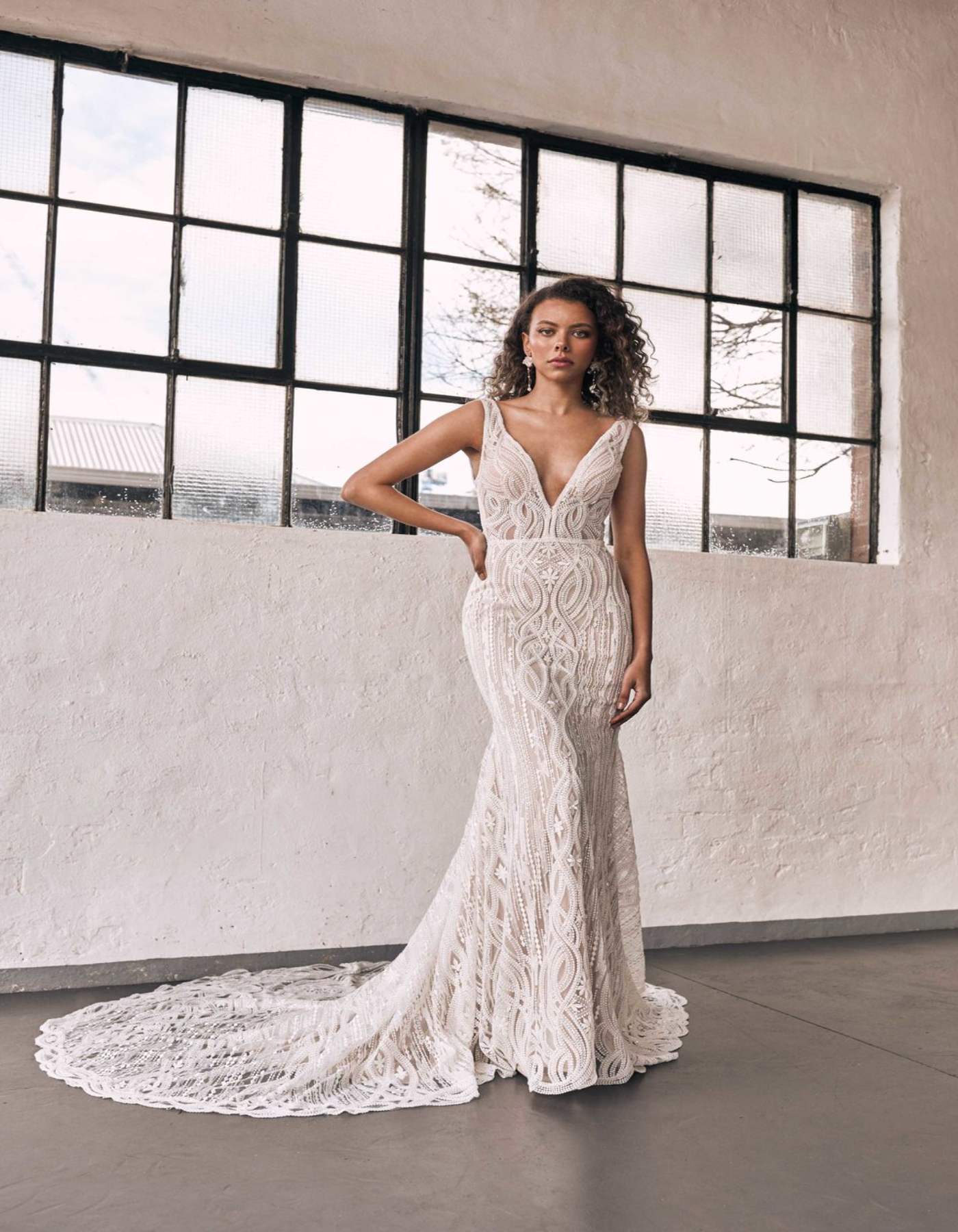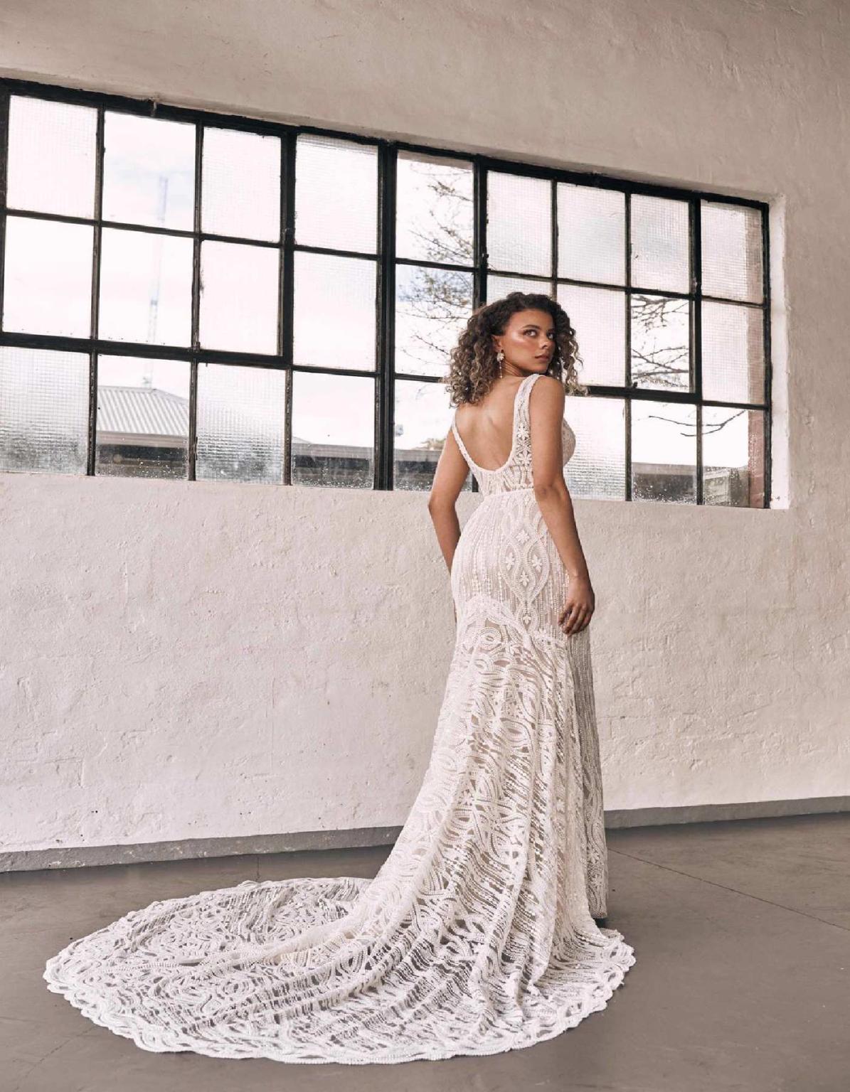 The Zavana Couture ZC 322 wedding gown is the perfect combination of fit and flare and sheath. With modern beaded lace encompassing the entire gown, a stunning V neck, scoop back and train, this gown creates a silhouette of dreams.Price: Original price was: $4,299.00.$2,999.00Current price is: $2,999.00.