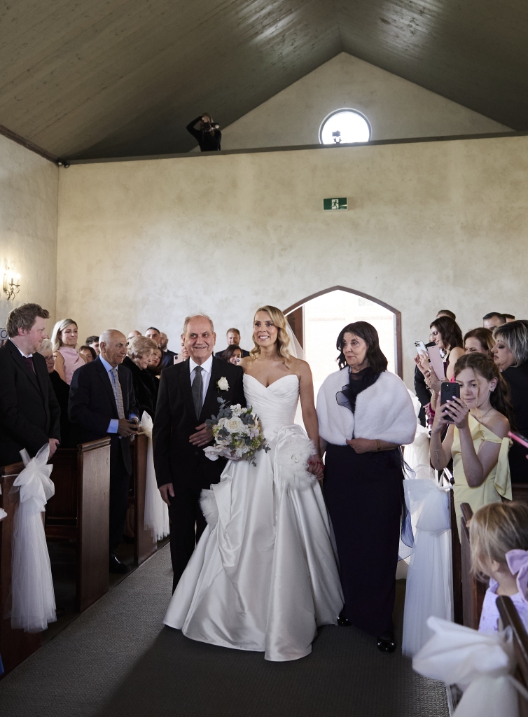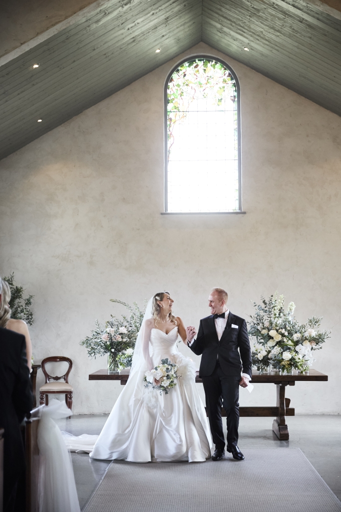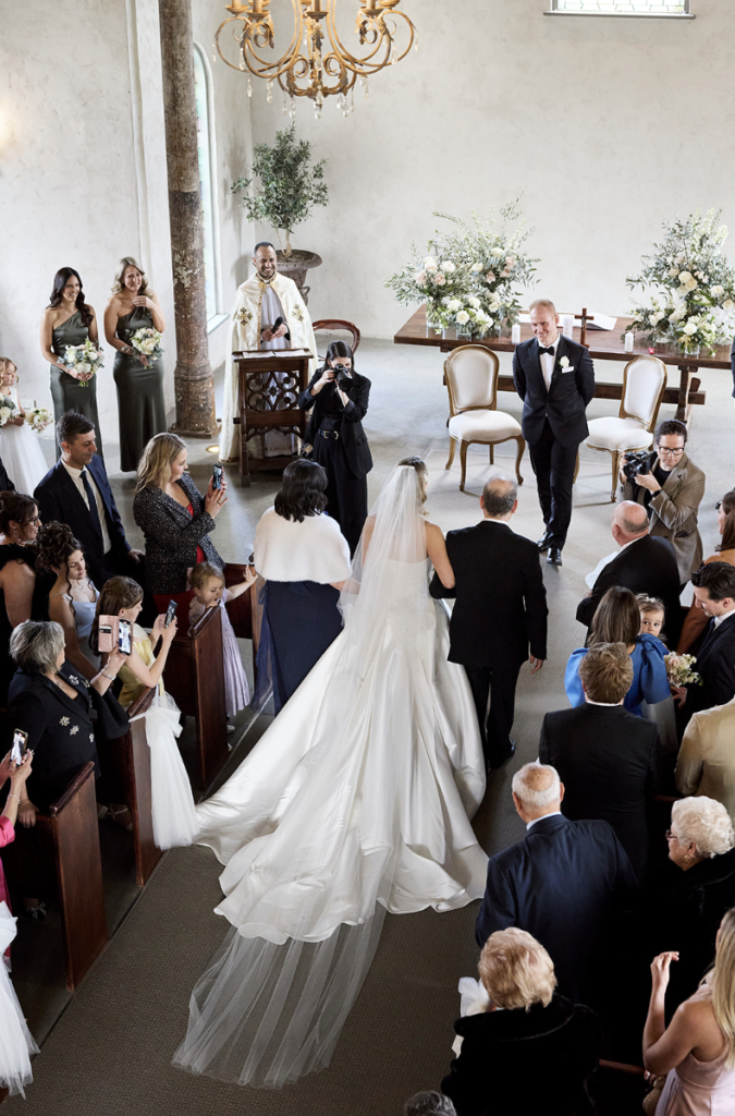 Set within the chapel, the ceremony introduced a striking contrast to the softness of the landscape outside. Captured in dramatic light and shadow, it felt intimate, almost cinematic.